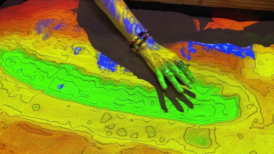 O objeto que mais chama atenção na exposição é a caixa de areia que simula relevos e efeitos de fenômenos naturais ou da ação do homem, como mostra a aluna Fernanda Euclesia.