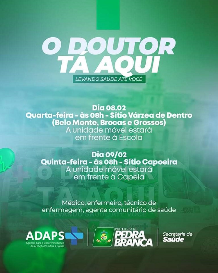 A prefeitura de Pedra Branca, no Vale do Piancó, deu início nesta quarta-feira (8) ao Projeto “O Dr. está aqui”. O programa é uma iniciativa da Prefeitura municipal em parceria com o Governo Federal e vai levar um médico até as comunidades rurais para atender as necessidades básicas dos moradores. A primeira comunidade escolhida foi Várzea de Dentro.