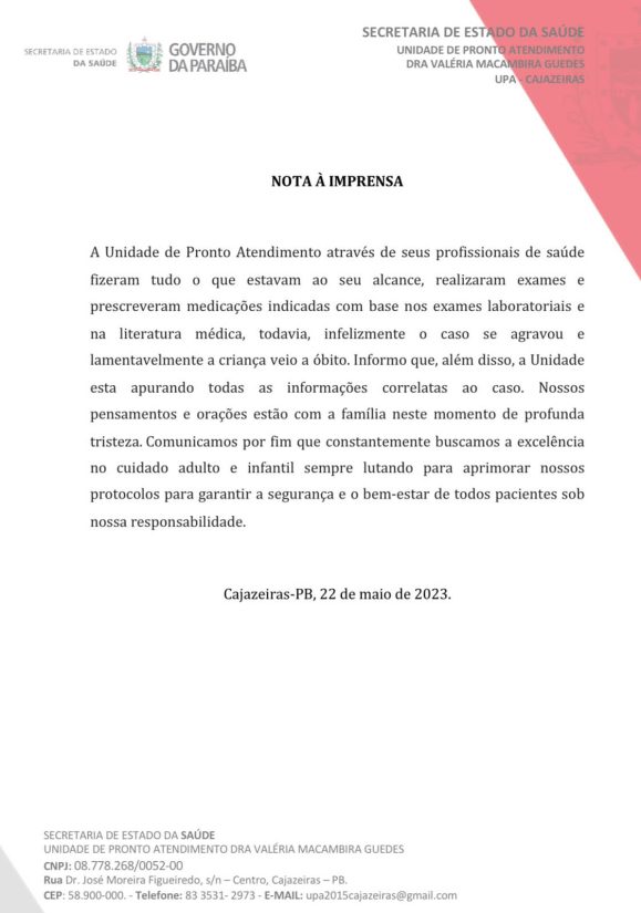 Em nota, a Unidade de Pronto Atendimento disse que os profissionais de saúde fizeram tudo que estava ao alcance, realizando exames e prescrevendo medicações indicadas com base nos exames laboratoriais, mas o caso se agravou e a criança não resistiu e veio a óbito. A UPA também garantiu que irá apurar todos os relatos dos familiares sobre o atendimento da médica plantonista.