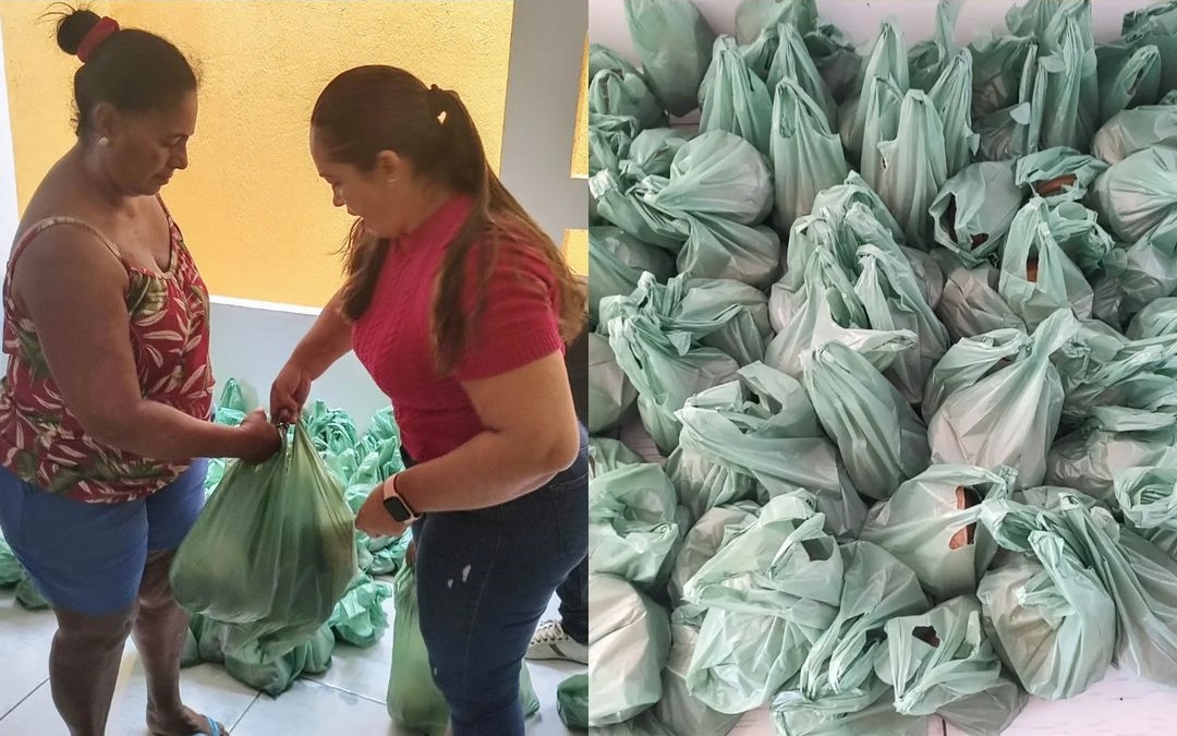 As famílias levaram pra casa em cada cesta, os alimentos: Macaxeira, Limão, Coco, Mamão, Arroz Vermelho, Abóbora, Banana, Bolo, Doce e Carne Suína