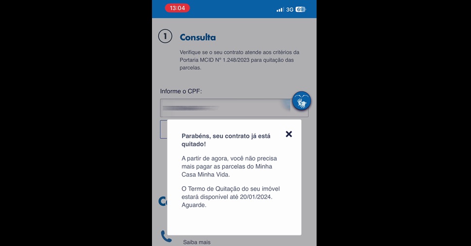 Essa dúvida surgiu após alguns moradores acessarem um aplicativo da Caixa Econômica Federal para efetuar pagamento de parcela, mas receberam uma mensagem no próprio aplicativo avisando que o apartamento já está quitado.