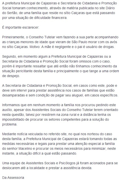 Na nota, a prefeitura informou que o Conselho Tutelar é conhecedor da situação do agricultor Cicero Macelino, de 65 anos de idade, que está sendo despejado da casa onde mora com três filhos, sendo dois menores de idade e quatro netas, todas menores, que vieram de São Paulo, porém, nada foi feito para ajudar a família.