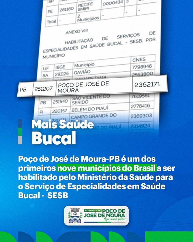 Por meio de portaria publicada nessa terça-feira (11) no Diário Oficial da União, o Ministério da Saúde habilitou o município de Poço de José de Moura, no Alto Sertão da Paraíba, para a implantação de um SESB (Serviço de Especialidades em Saúde Bucal).
