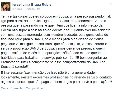 “Eitcha Brasil que não tem jeito, vamos acordar e servir a população SAMU de Sousa, vamos deixar de preguiça, pois quem paga o salário de vocês é a população”, disse Israel Rubis.