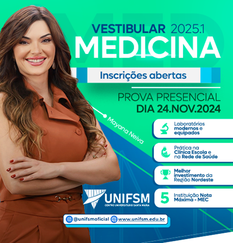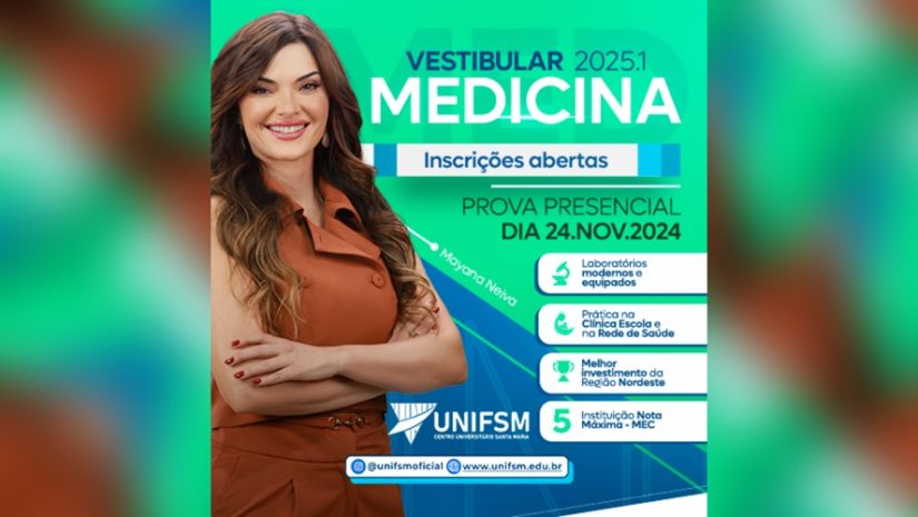 O Centro Universitário Santa Maria (UNIFSM) abriu, nessa segunda-feira (16), as inscrições para o vestibular de medicina 2025.1. Os candidatos têm até o dia 14 de novembro para se inscrever através do site oficial da instituição: unifsm.edu.br. A prova será realizada de forma presencial no dia 24 de novembro, em Cajazeiras-PB.