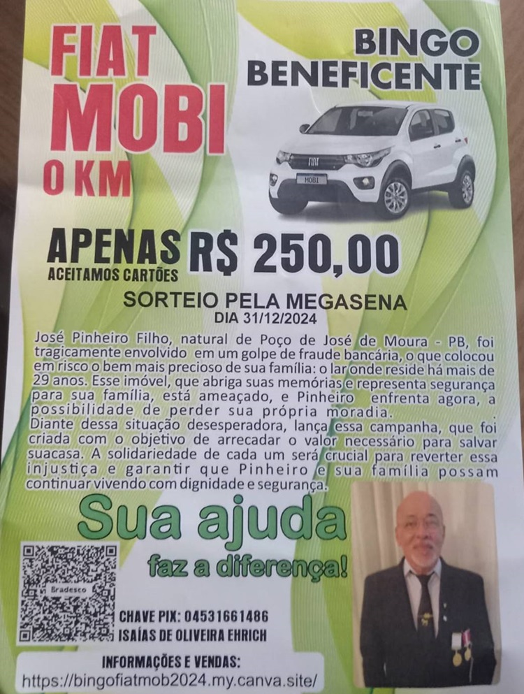 O apelo de “Pinheiro”, como assim é conhecido, não se trata apenas de pedir ajuda, mas ele está promovendo um bingo beneficente, de um carro 0 km. A cartela custa R$ 250,00. O sorteio será dia 31 de dezembro e as pessoas podem adquirir por meio de cartão de crédito.