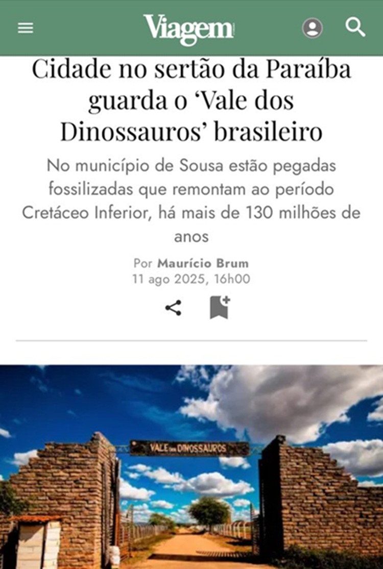 A publicação, assinada pelo jornalista Maurício Brum, mostra como o município paraibano se consolida como um destino singular para o turismo científico e de natureza, ao reunir pegadas fossilizadas com mais de 130 milhões de anos, registradas em formações rochosas da Bacia do Rio do Peixe.