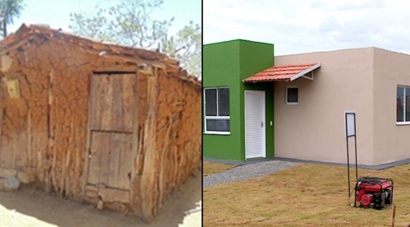 Imagem ilustrativa – Casa de taipa – reprodução/site da Prefeitura de Sumé-PB – Foto da casa nova – reprodução/Governo de Goiás