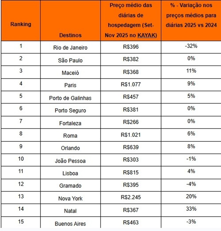 Hospedagem – O levantamento foi realizado com base em buscas por hospedagens realizadas no kayak.com.br e seus sites associados no período de 01/02/2025 a 31/07/2025, para viagens entre 01/09/2025 e 15/11/2025. Os preços médios são para uma diária em quarto duplo, para todas as classificações de estrela combinadas (de 1 a 5), e podem variar com o tempo. A economia não é garantida.