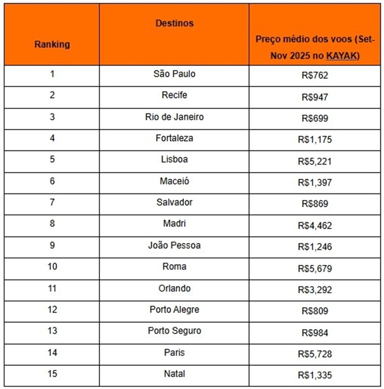 Voos – O levantamento foi realizado no dia 19 de agosto de 2025, na base de dados do kayak.com.br e marcas associadas, considerando buscas de 01/02/2025 a 31/07/2025 por voos de ida e volta, em classe econômica, de todos os aeroportos do Brasil, para todos os aeroportos do mundo, para datas de viagem entre 01/09/2025 e 15/11/2025. Os mesmos períodos do ano passado foram usados para comparações. Os preços são uma média e podem variar com o tempo. A economia não é garantida e as porcentagens são aproximadas.