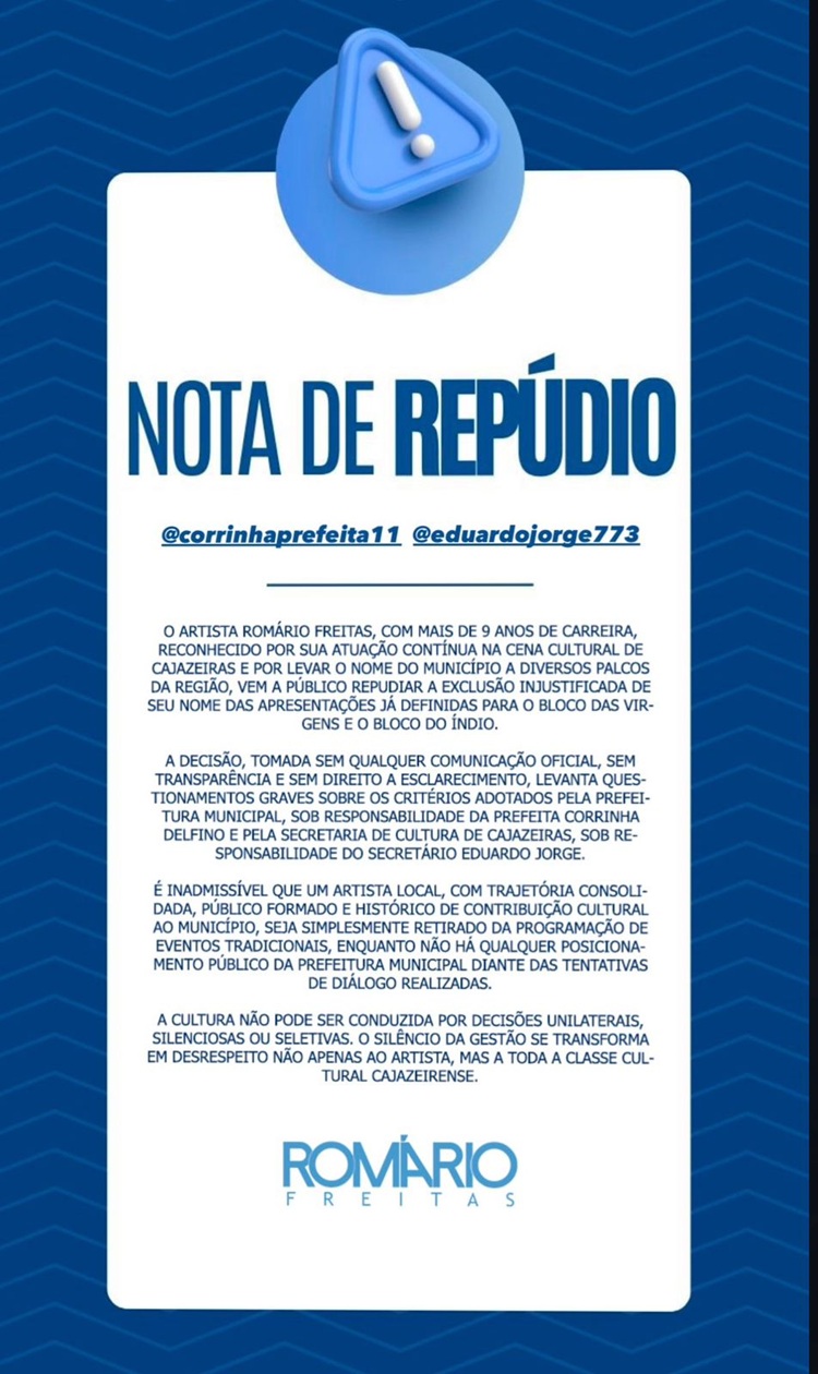 A equipe de Romário Freitas divulgou uma nota de repúdio na qual afirma que a decisão de cancelar seus dois shows “levanta questionamentos graves sobre os critérios adotados pela prefeitura municipal, sob responsabilidade da prefeita Corrinha Delfino, e pela Secretaria de Cultura de Cajazeiras, sob responsabilidade do secretário Eduardo Jorge”.