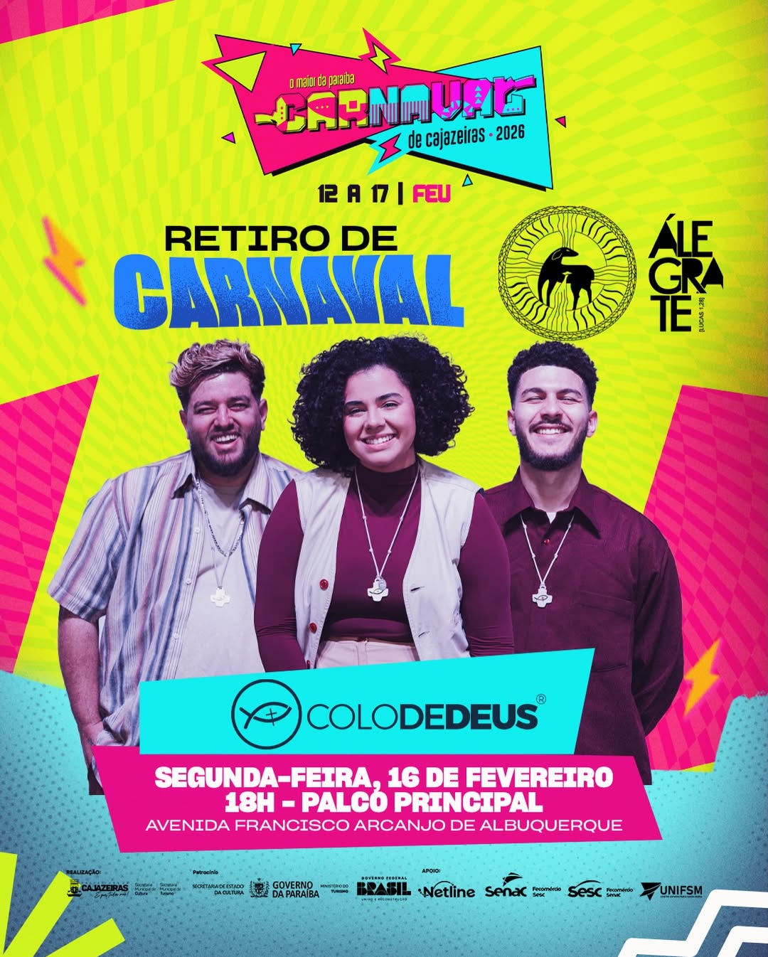 Já na segunda-feira (16), o dia começa com a pregação às 9h, conduzida por Raquel Andrade e Filipe, proporcionando um momento especial de reflexão e intimidade com Deus. À noite, a programação ganha ainda mais força com o show da banda Colo de Deus, que promete incendiar os corações da juventude e das famílias com louvor e adoração. Este momento acontecerá de forma especial no Corredor da Folia de Cajazeiras, na Avenida Francisco Arcanjo de Albuquerque.