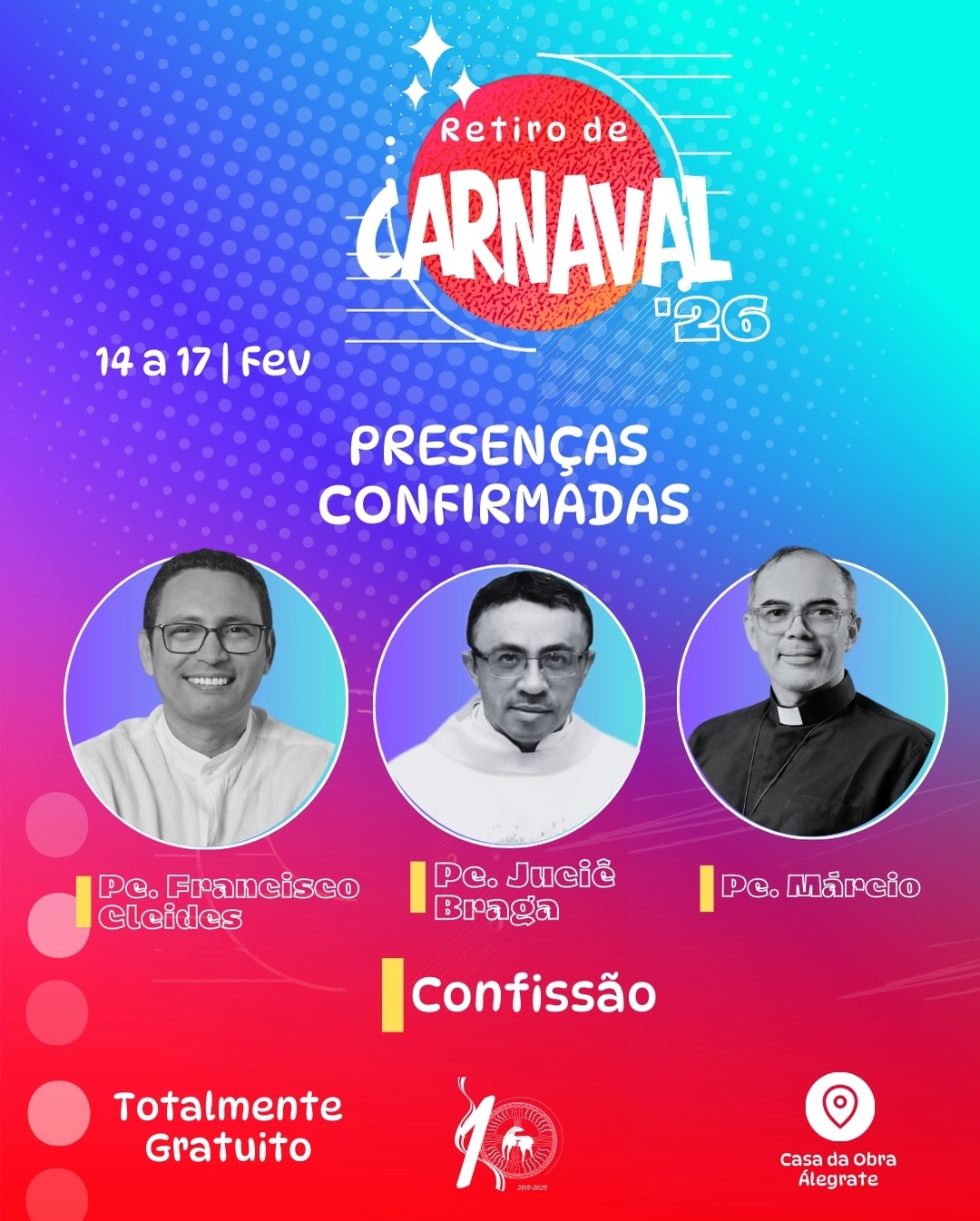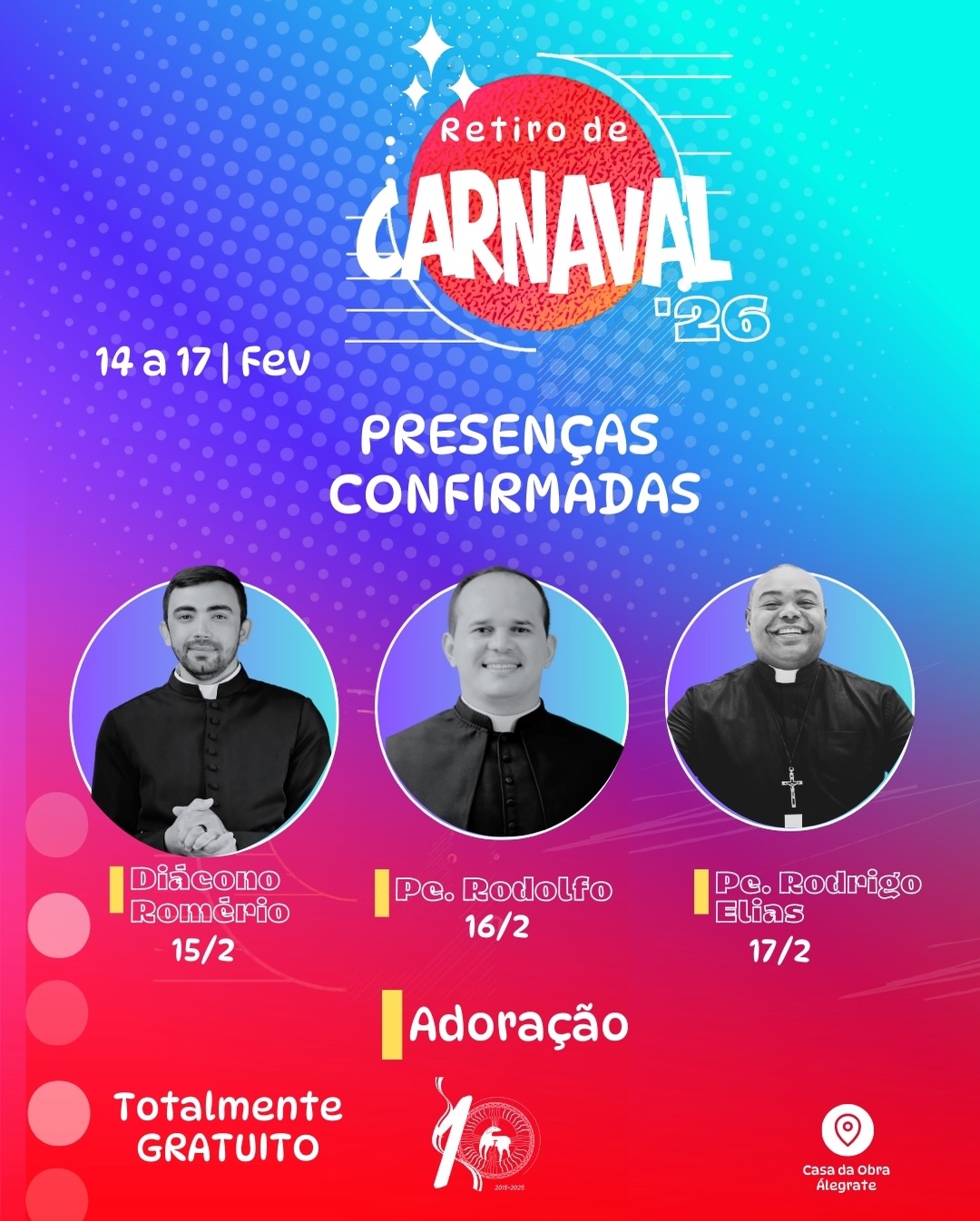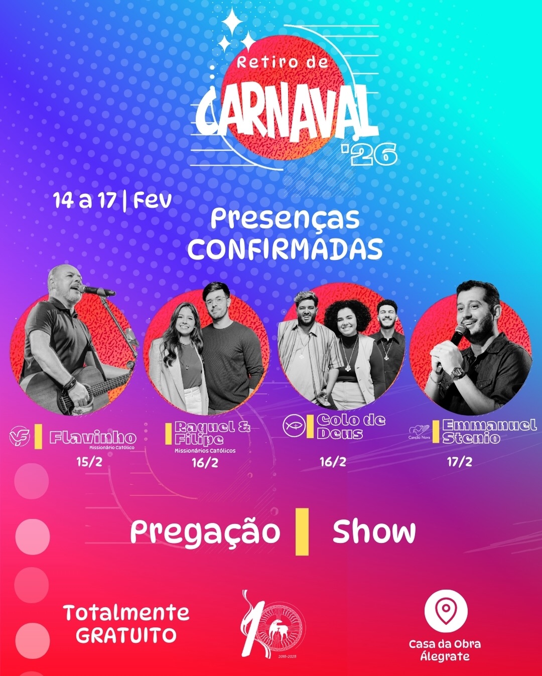 O retiro será realizado na Casa da Obra Álegrate de Maria, localizada na Rua Francisca Fernandes Claudino, com exceção do show da Colo de Deus, que acontecerá em espaço aberto, integrando fé e evangelização no coração da cidade.