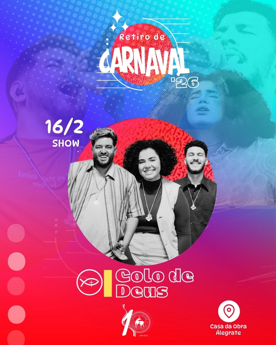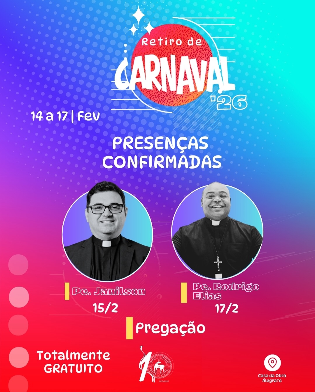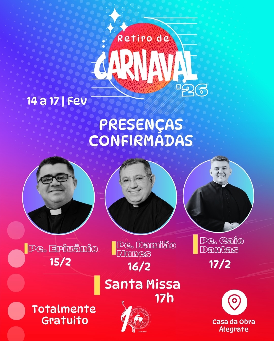 O retiro será realizado na Casa da Obra Álegrate de Maria, localizada na Rua Francisca Fernandes Claudino, com exceção do show da Colo de Deus, que acontecerá em espaço aberto, integrando fé e evangelização no coração da cidade.