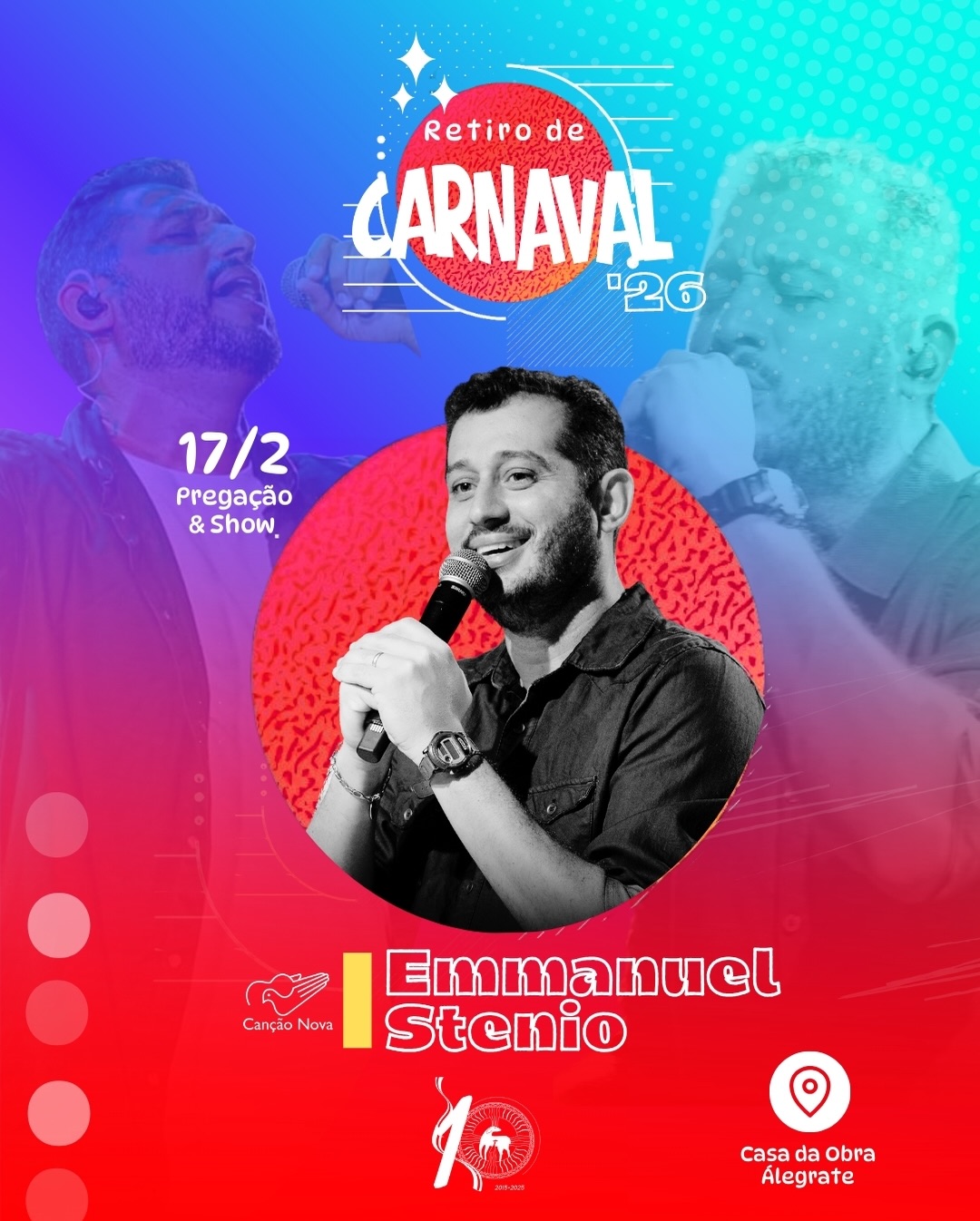 Encerrando esse ciclo de graças, o último dia do retiro será conduzido por Emanuel Stênio, da Canção Nova, que ficará responsável por guiar os participantes no fechamento do encontro, coroando o retiro com momentos de profunda entrega e espiritualidade.