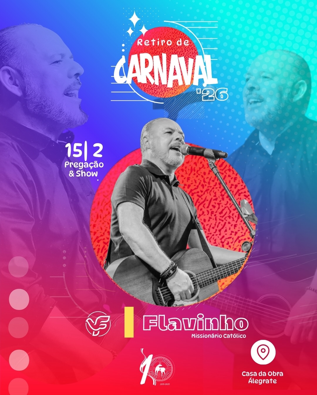 No domingo, segundo dia do retiro, a programação contará com a presença de Flavinho, conhecido por sua história de vida e canções que marcaram gerações, o momento promete ser de forte experiência espiritual e profunda oração.