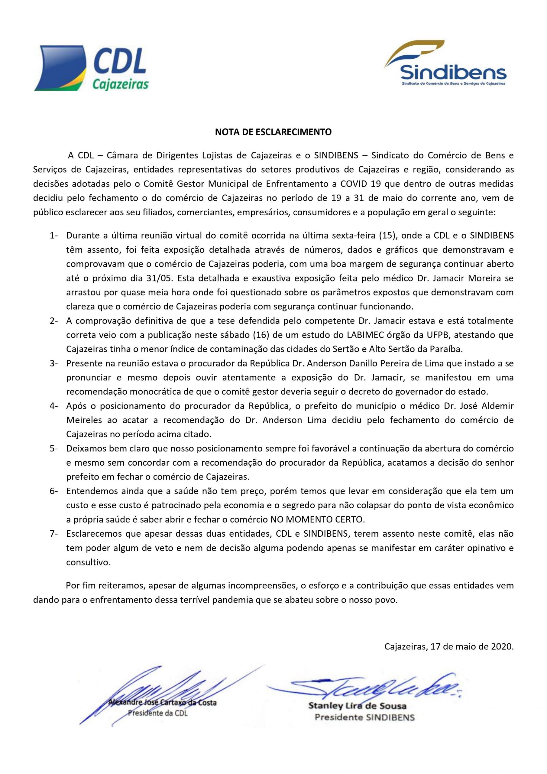 Nota de esclarecimento foi assinada pelos presidentes da CDL e pelo Sindibens de Cajazeiras, respectivamente