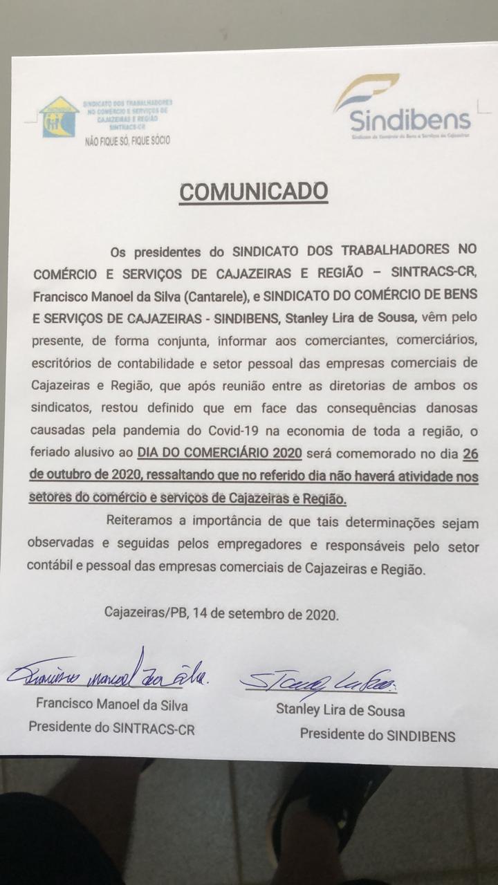 ‘’Definido que em face das consequências danosas causadas pela pandemia da Covid-19 na economia de toda a região, o feriado alusivo ao DIA DO COMERCIÁRIO 2020 será comemorado no dia 26 de outubro de 2020, ressaltando que no referido dia não haverá atividade nos setores do comércio e serviços de Cajazeiras e região’’, diz trecho da nota.