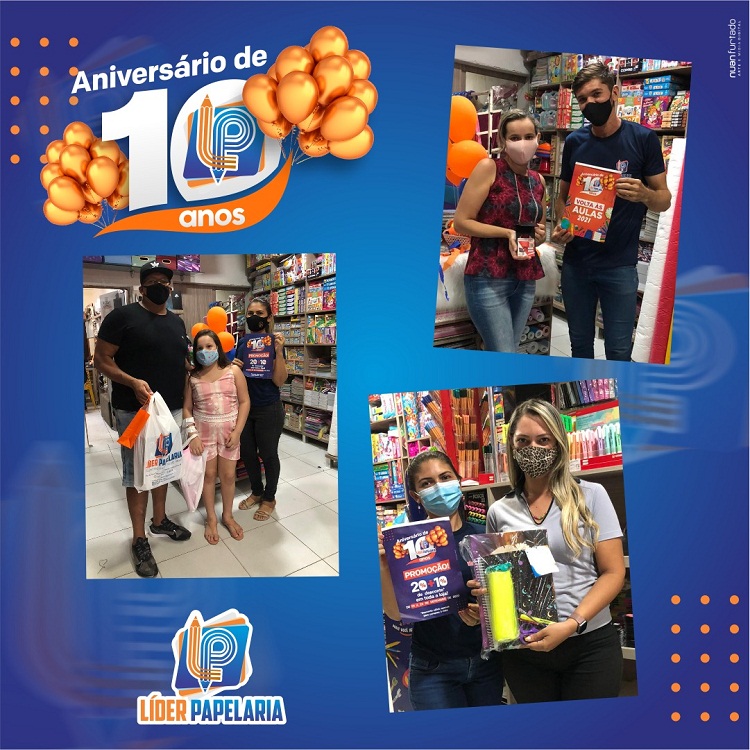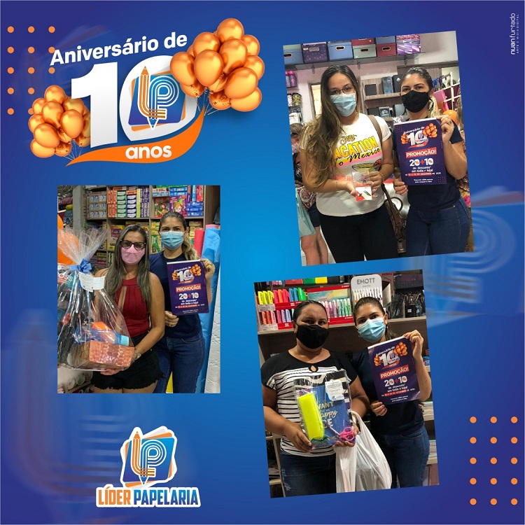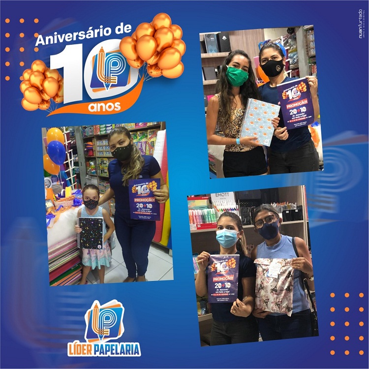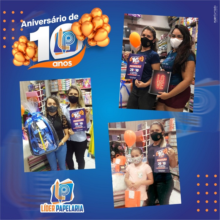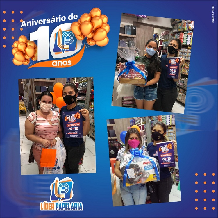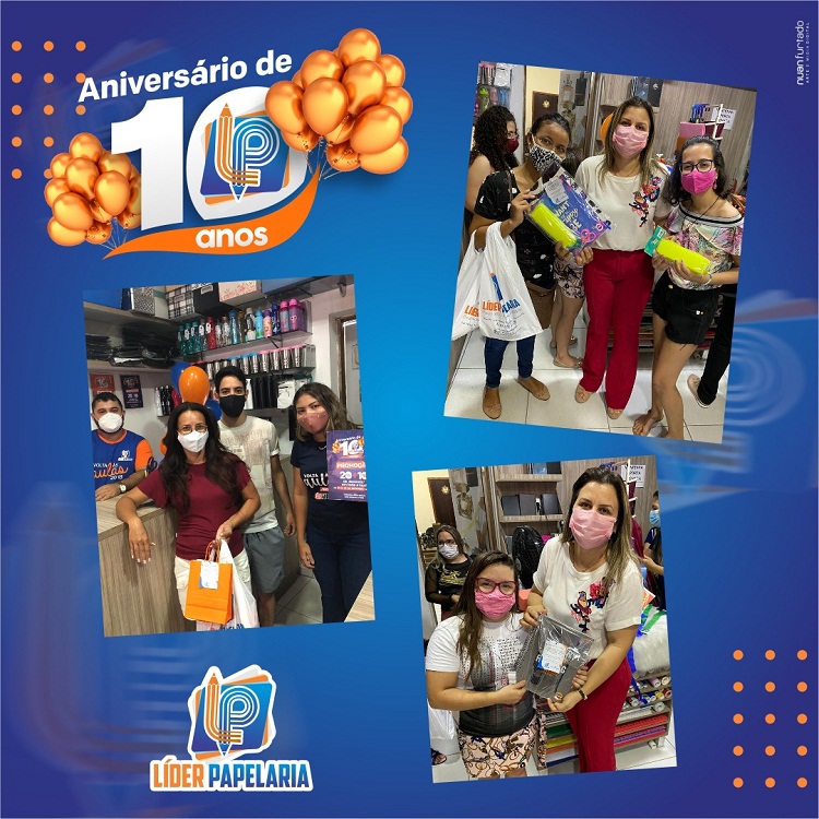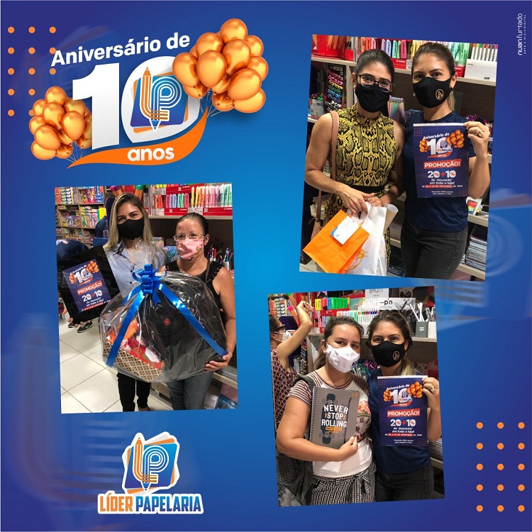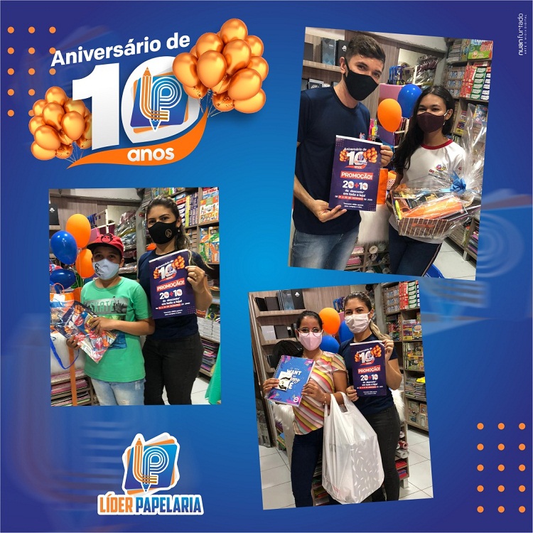 Neste mês de dezembro, a Líder Papelaria comemorou 10 anos de fundação em Cajazeiras sorteando presentes com os clientes e com uma série de promoções especiais. Além dos sorteios, a Líder Papelaria ofereceu descontos de 20% + 10% nas compras à vista.
