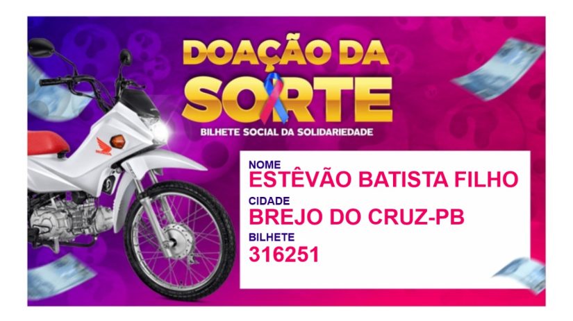 O ganhador da moto pop foi Estêvão Batista Filho da cidade de Brejo do Cruz, na região de Catolé do Rocha, com o bilhete 316251.