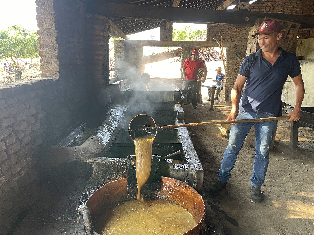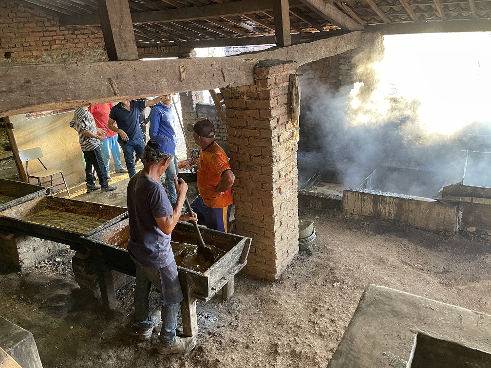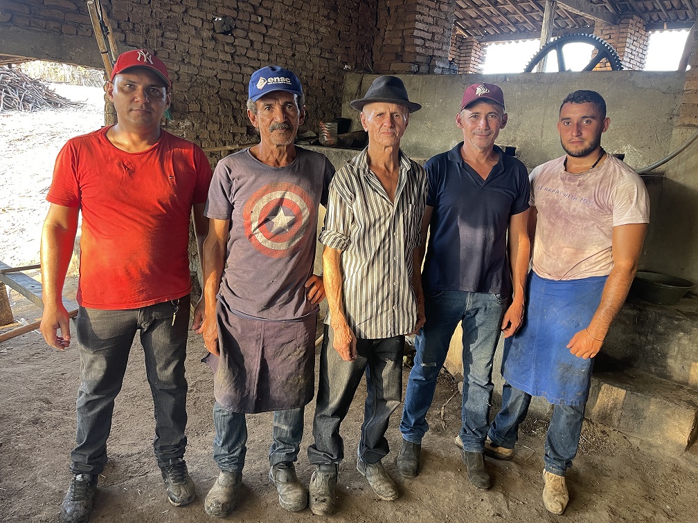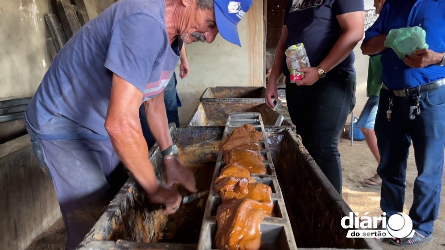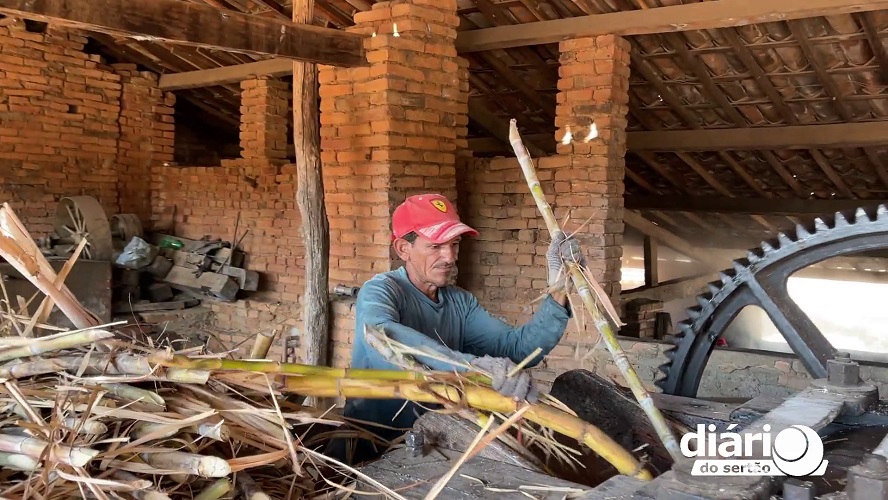 Francisco Gilvan dá detalhes do passo a passo do trabalho, desde o corte da cana, o transporte em animais, a moagem e a produção final dos doces. “O corte ocupa quatro cortadores de cana. Na parte do cambito, o transporte em burros, estamos usando cinco cambiteiros e uma média de sete burros transportando pra cá. O dia anterior é só pra encostar a cana. A gente Moi, mas eles continuam trazendo cana pra nós quebrar aqui no engenho”, conta o agricultor.
