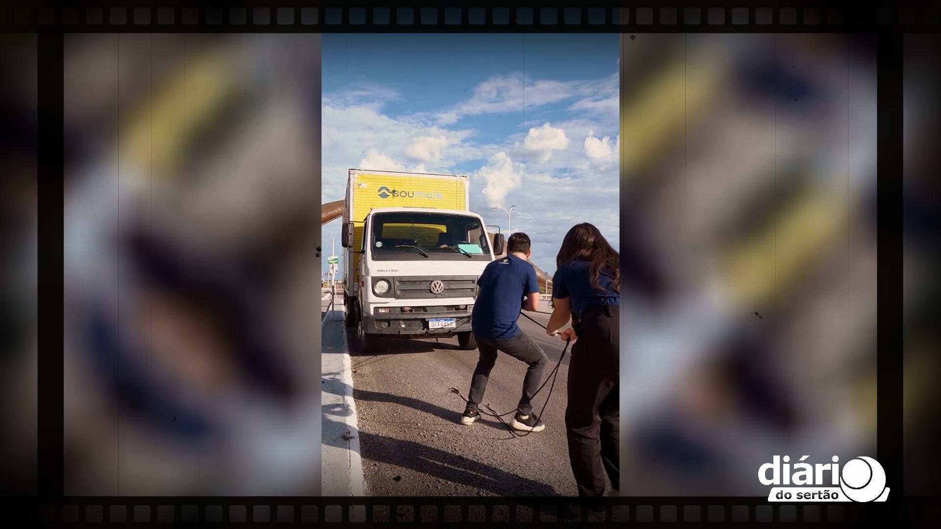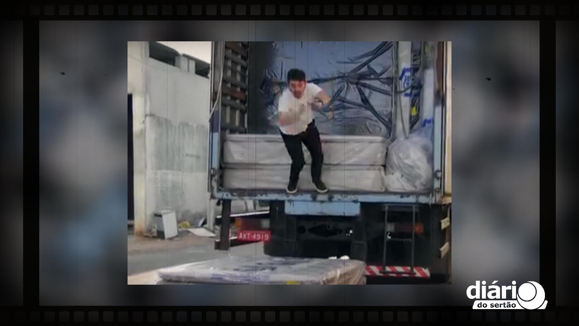 Um dos vídeos viralizou na internet foi o que Luiz Henrique, pula do caminhão em vários colchões (Foto: reprodução redes sociais)