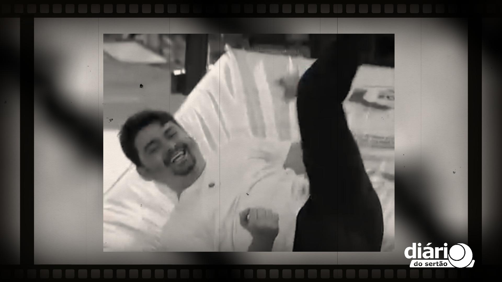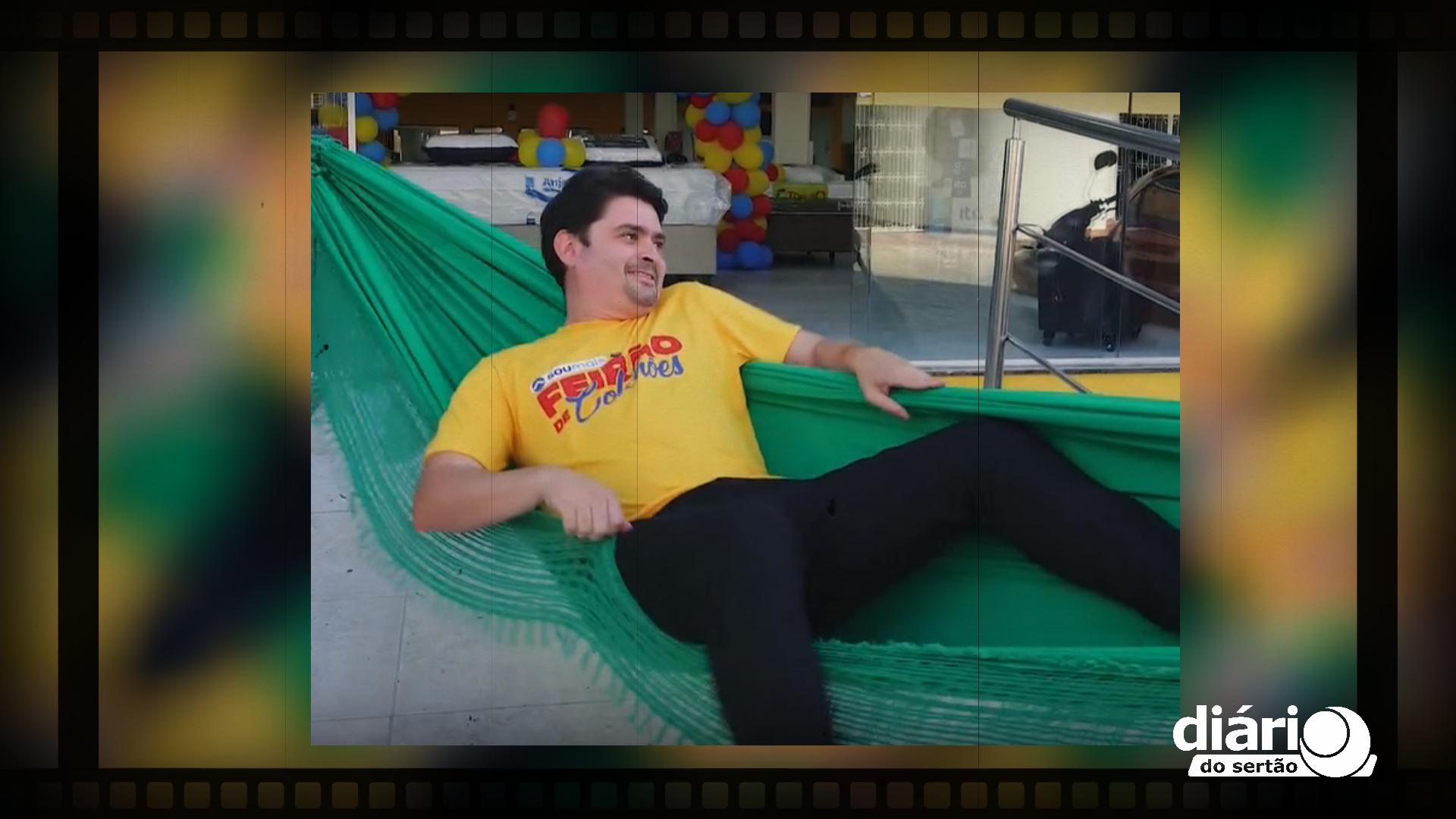 Outro vídeo que viralizou foi o de Luiz Henrique deitado na rede, onde anuncia a promoção “Feirão de Colchões” (Foto reprodução redes sociais)