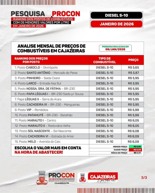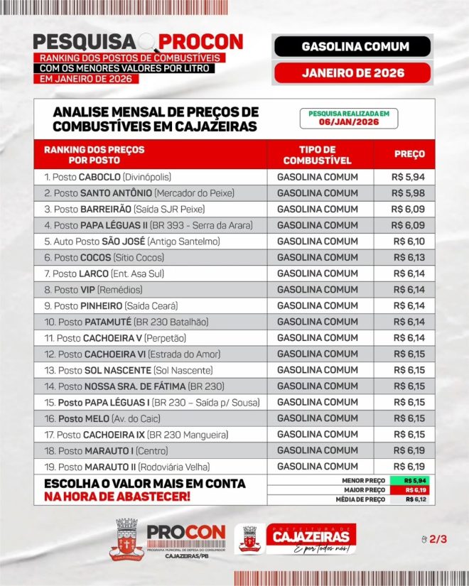 O PROCON Municipal de Cajazeiras realizou, neste mês de janeiro, uma operação de fiscalização e monitoramento em 19 postos de combustíveis localizados nas áreas urbana e rural do município. A ação teve como objetivo analisar a composição de preços praticada no mercado local e orientar consumidores sobre seus direitos.