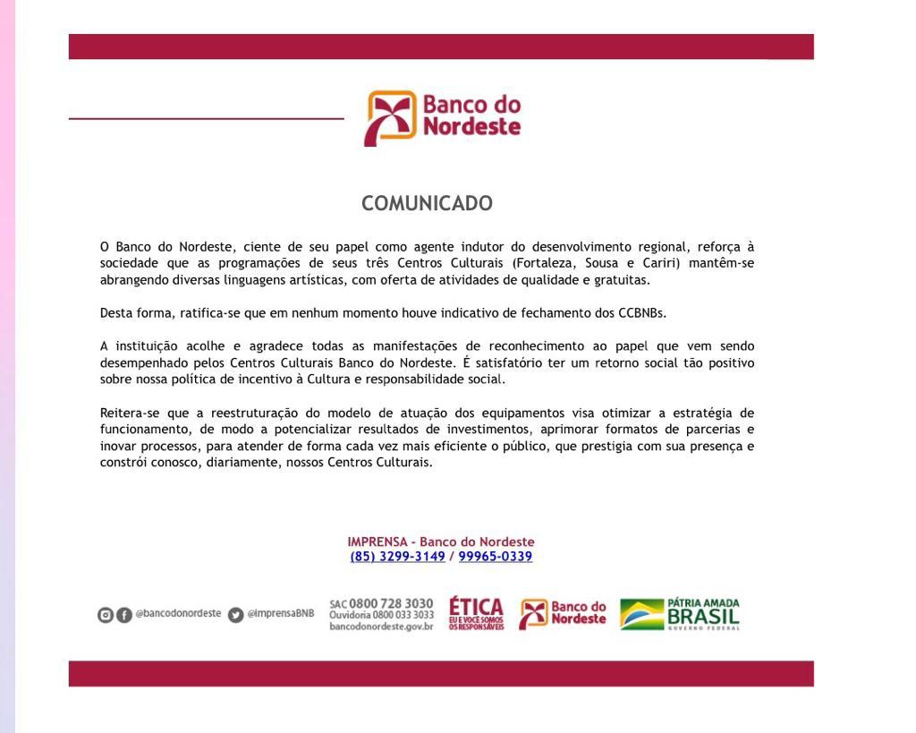 Logo após a reunião com o deputado Efraim Filho, a direção do Banco do Nordeste soltou comunicado oficial garantindo que não haverá fechamento dos centros culturais, mas sim uma otimização da estratégia de funcionamento.