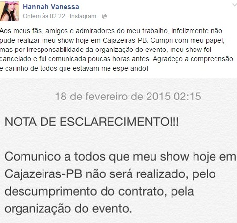 A cantora pediu desculpas aos seus fãs e criticou de irresponsáveis os organizadores da festa em Cajazeiras. Hannah Vanessa emitiu uma Nota de Esclarecimento na sua página do Facebook. Ela havia divulgado a agenda oficial e o nome de Cajazeiras estava na lista.