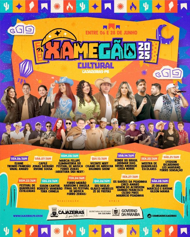 O Xamegão Cultural 2025 da cidade de Cajazeiras começou nesta sexta (06) e vai até o dia 28, confira a programação completa: