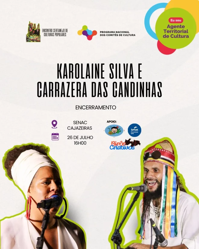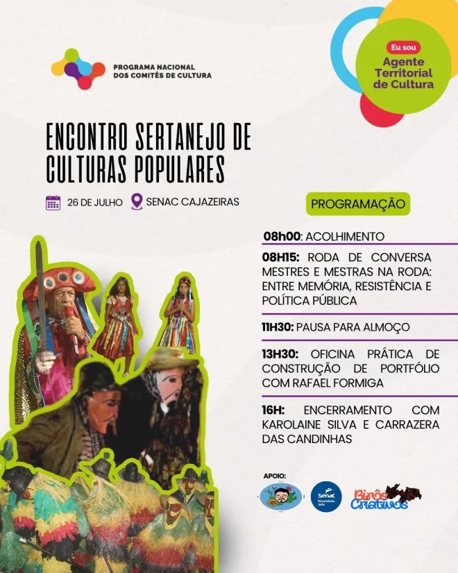 Artistas e agentes culturais de Cajazeiras e região têm um compromisso agendado para o próximo dia 26 de julho. O Senac Cajazeiras receberá, a partir das 8h, o Encontro Sertanejo de Culturas Populares, uma iniciativa voltada para o fortalecimento da identidade cultural regional e a capacitação de profissionais para acesso a editais e políticas públicas.