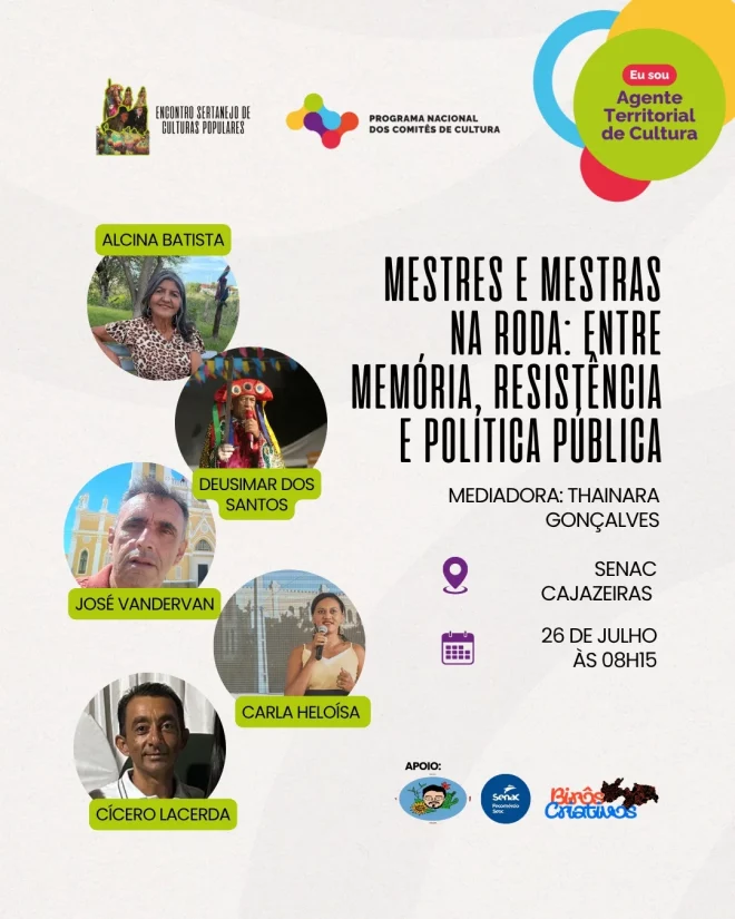 Realizado pelos produtores Thainara Gonçalves e Rafael Formiga, em parceria com o Sesc, o evento também terá mesa redonda com Mestres e Mestras da Cultura Popular da região