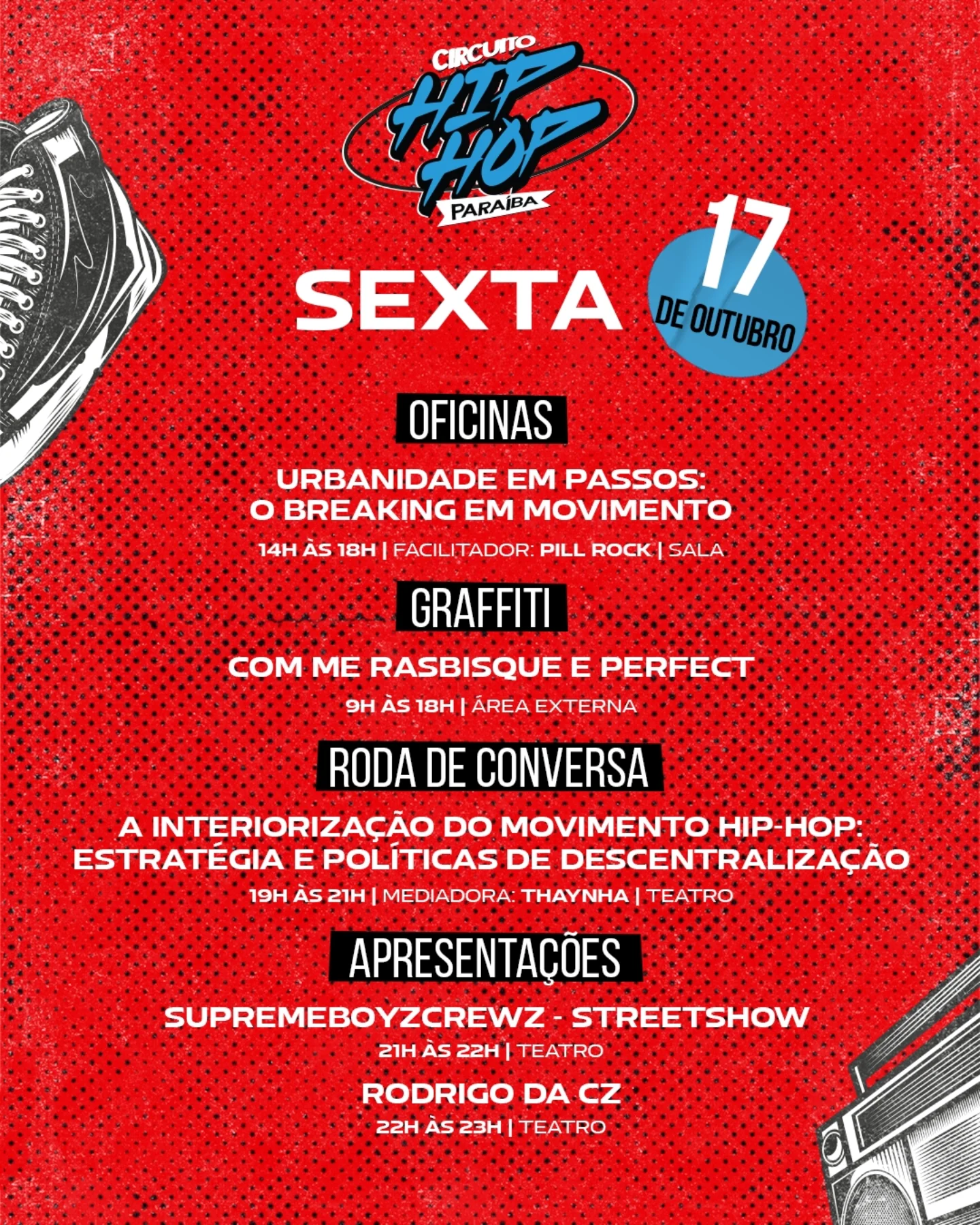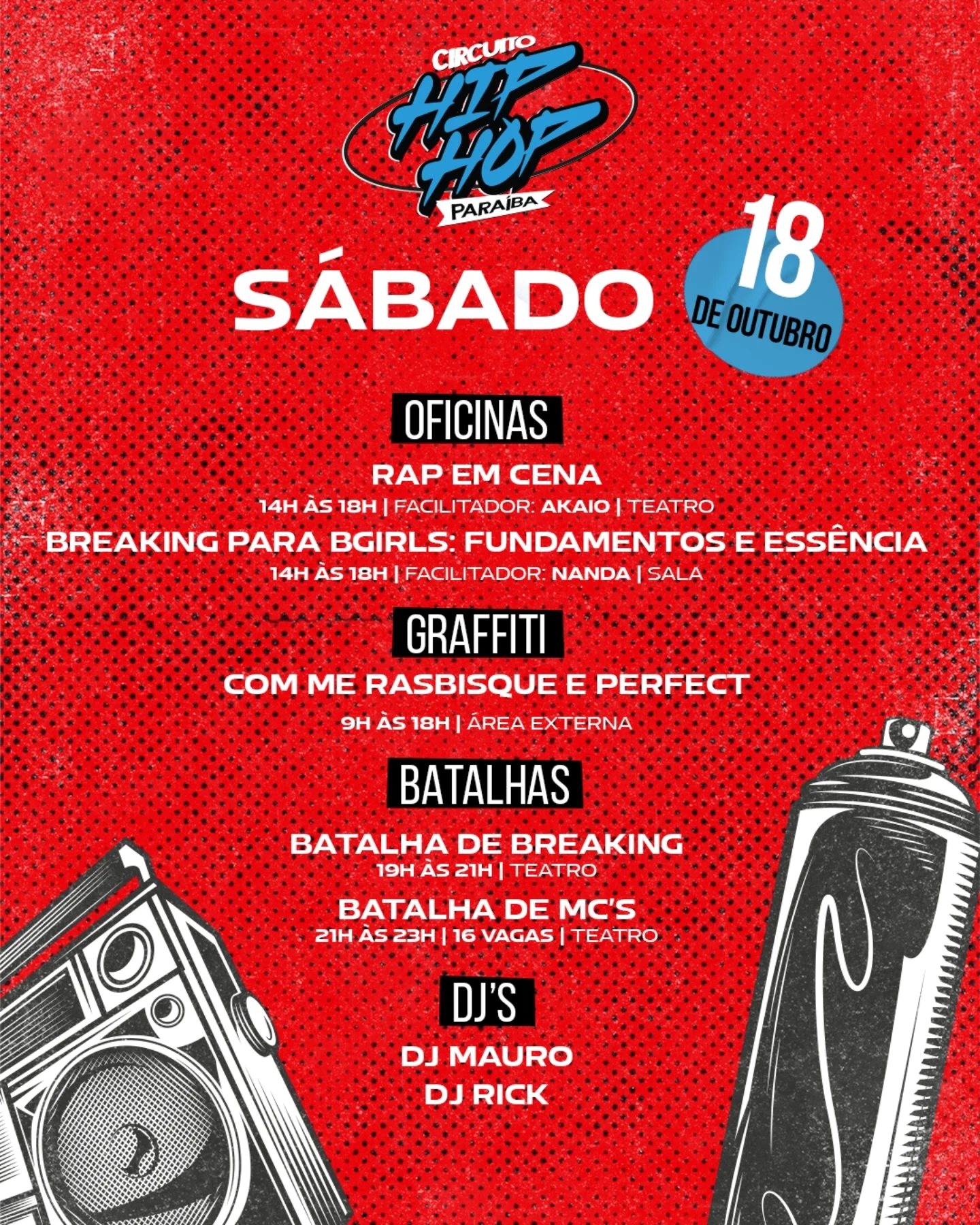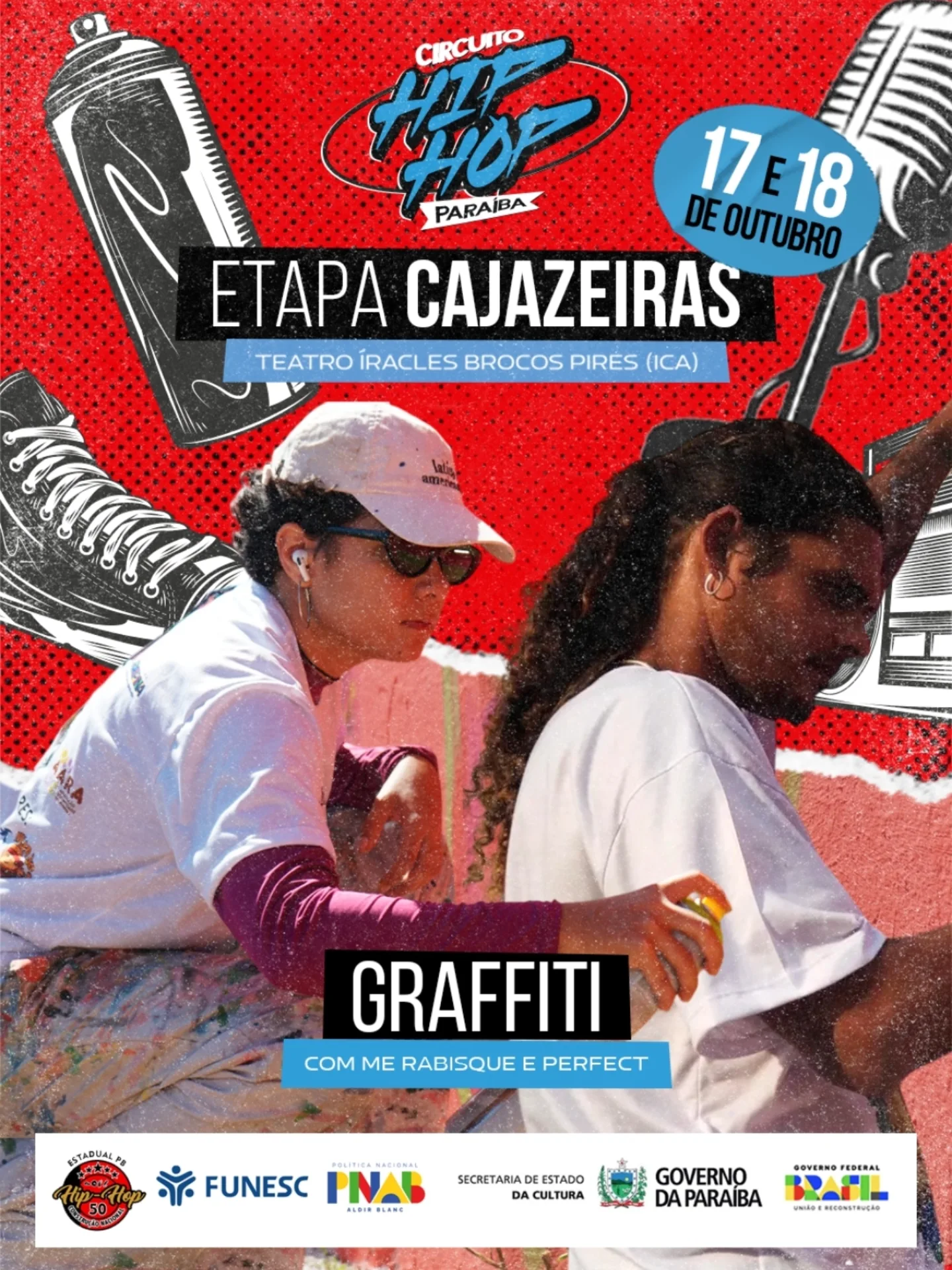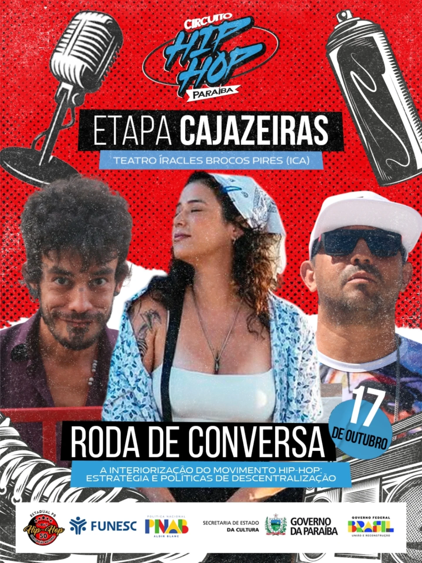 O Teatro Iratelhes Brocos Pires (ICA), em Cajazeiras, será palco para o “Circuito Hip Hop Paraíba”, evento que busca reconhecer e dar visibilidade à cultura Hip-Hop paraibana, promovendo a circulação, o intercâmbio e a valorização das diversas expressões artísticas do movimento no estado.