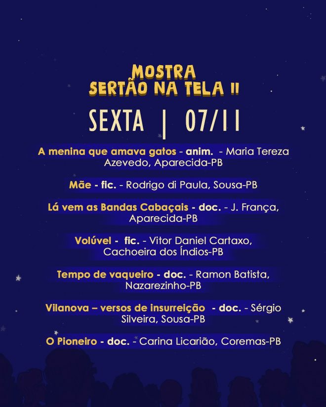 - Mostra Sertão na Tela I e II: Focada em produções do Sertão.