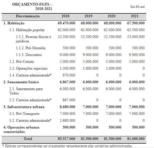 A previsão do Conselho é de que os recursos para habitação atendam a 528,3 mil pessoas no próximo ano; 525,8 mil em 2019 e, também, em 2020; com mais 525,3 mil em 2021. O total chega a mais de 2,1 milhões de moradias financiadas com o FGTS nos próximos quatro anos.