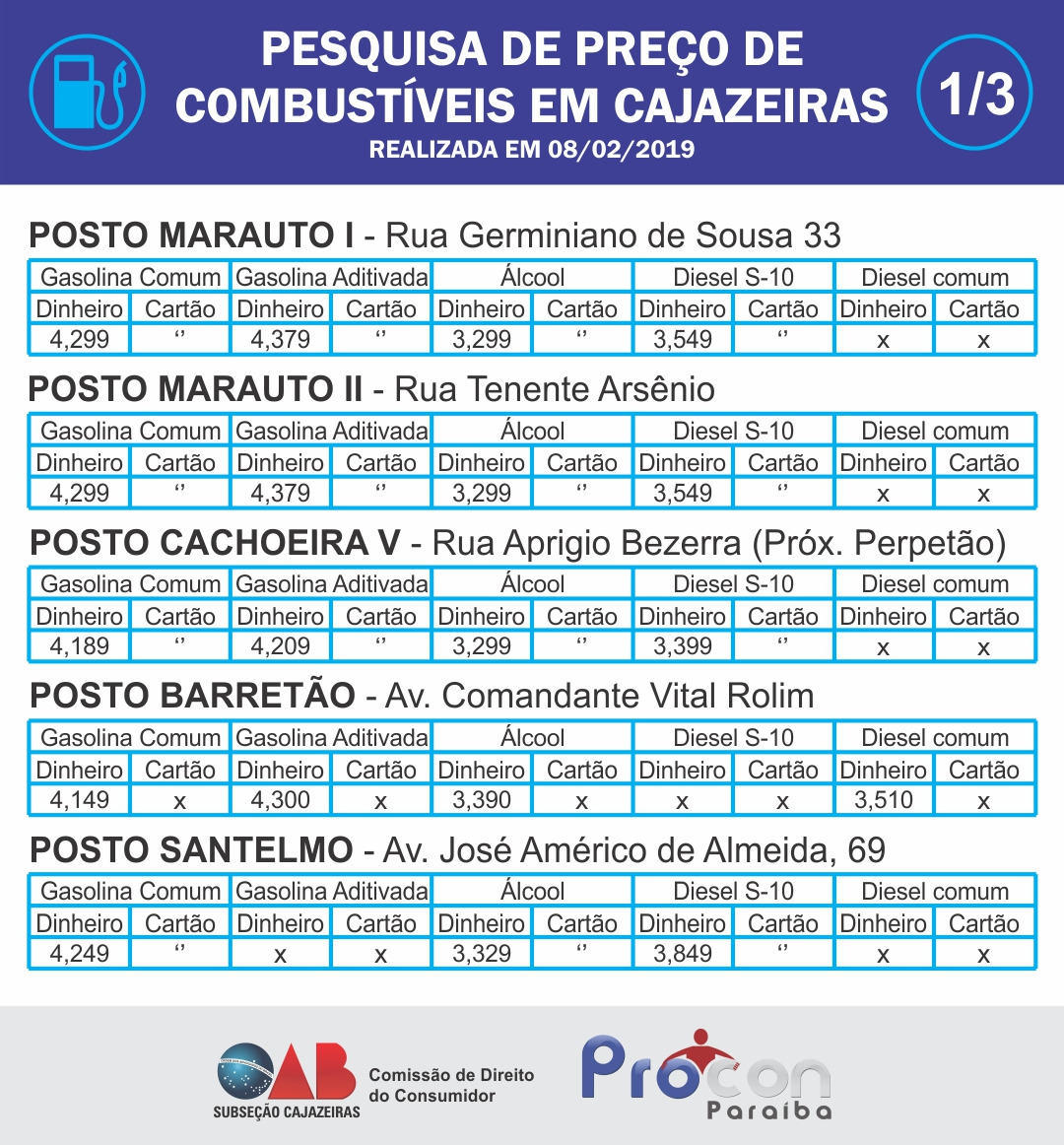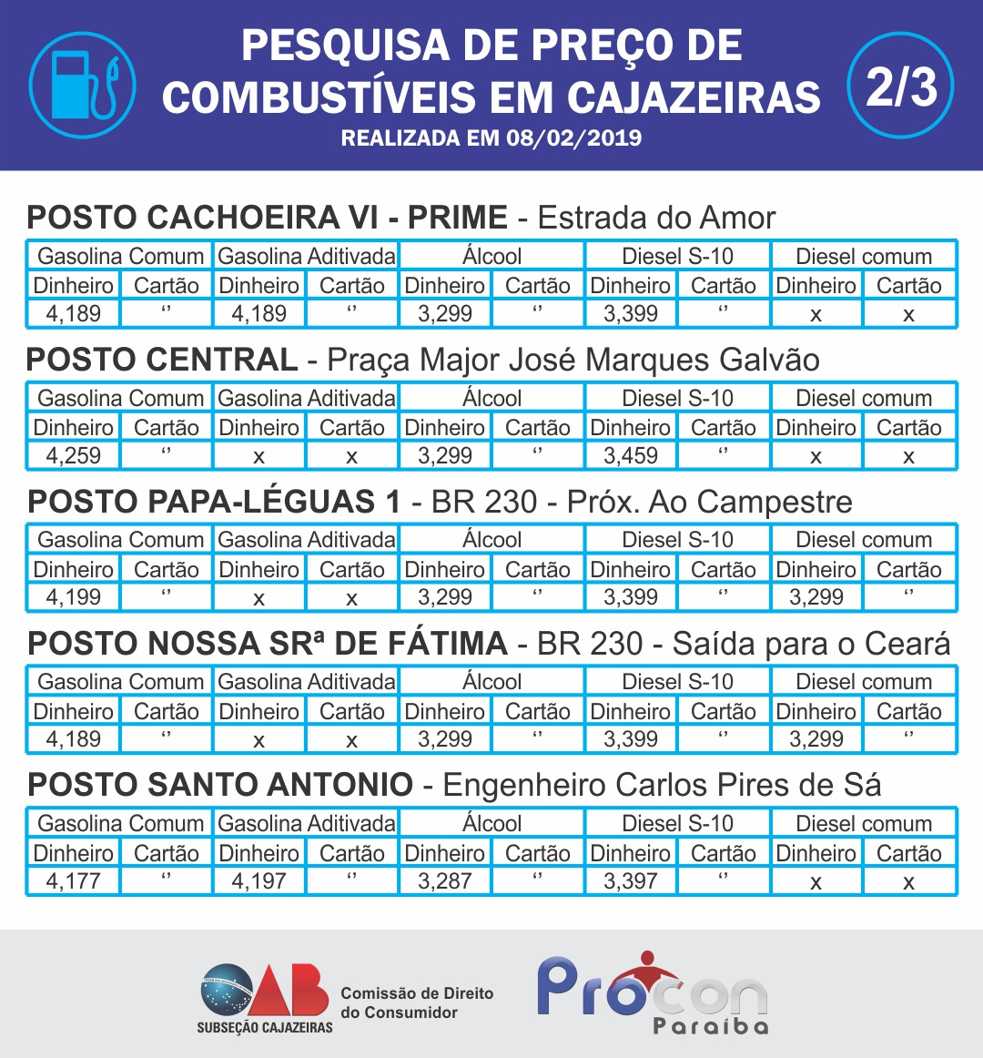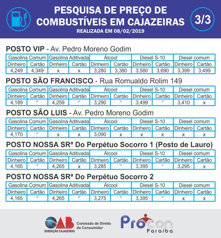 De acordo com o advogado Lívio Abreu, que atua no Procon e também é presidente da Comissão de Direitos do Consumidor da OAB de Cajazeiras, os 15 postos da zona urbana foram visitados e somente três da zona rural não passaram pela pesquisa por falta de tempo hábil para a divulgação.