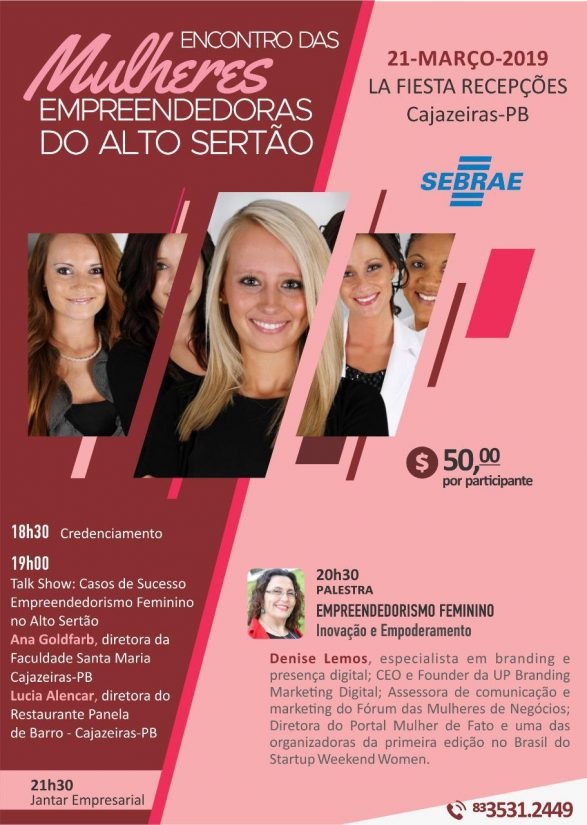 O Encontro das Mulheres Empreendedoras do Sertão é realizado pelo Sebrae. Na programação tem talk show às 19h com as empresárias Ana Goldfarb, diretora da Faculdade Santa Maria, e Lúcia Alencar, diretora do restaurante Panela de Barro; palestra às 20:30 com Denise Lemos, especialista em branding e presença digital; e jantar empresarial às 21:30.