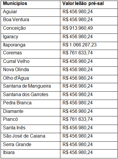 Municípios do Vale do Piancó receberam quase R$10 milhões do último leilão do pré-sal de 2019
