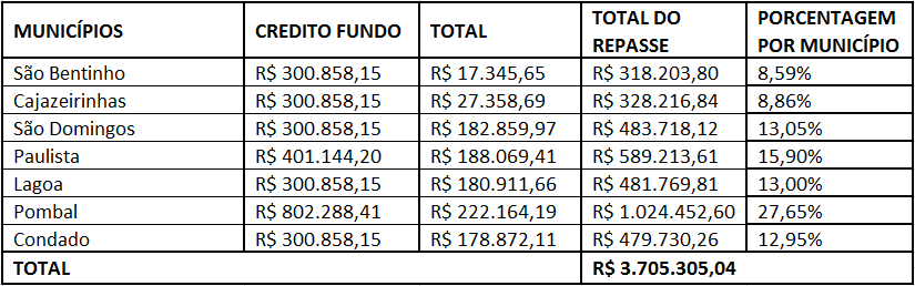 A Paraíba recebeu R$ 110,2 milhões, valor inferior aos R$ 123,4 milhões repassados em janeiro de 2019. O repasse para os municípios da região de Pombal foi de R$ 3.705.305,04.