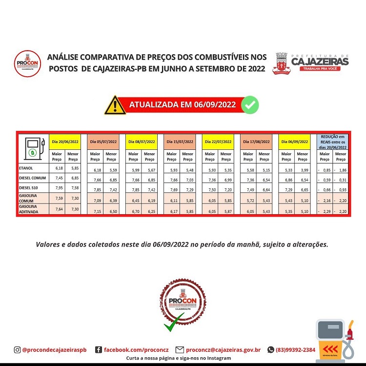 “O PROCON Cajazeiras mantém o seu compromisso com o consumidor cajazeirense de acompanhar periodicamente os preços dos combustíveis nos postos da nossa cidade, e mantê-los informados mensalmente dessas alterações da forma mais clara possível, em tabelas comparativas para a devida apreciação”, diz a divulgação.