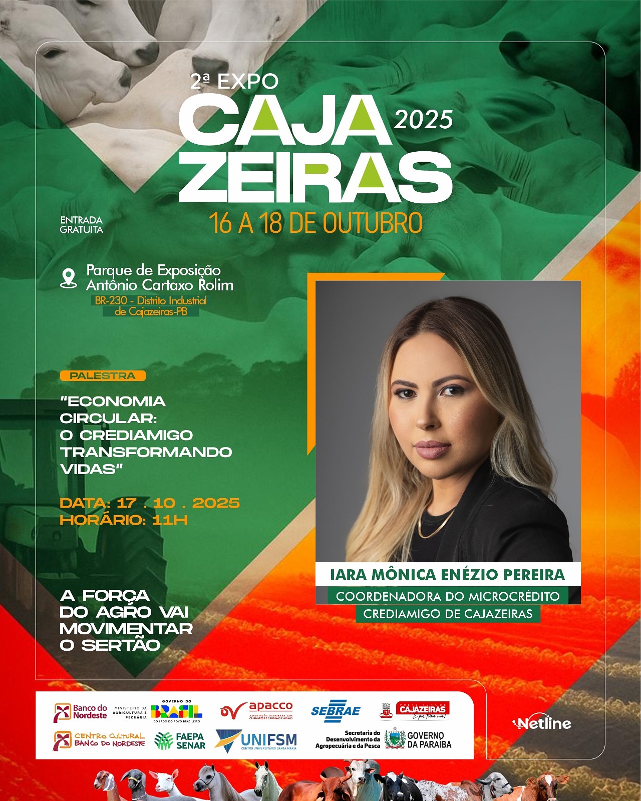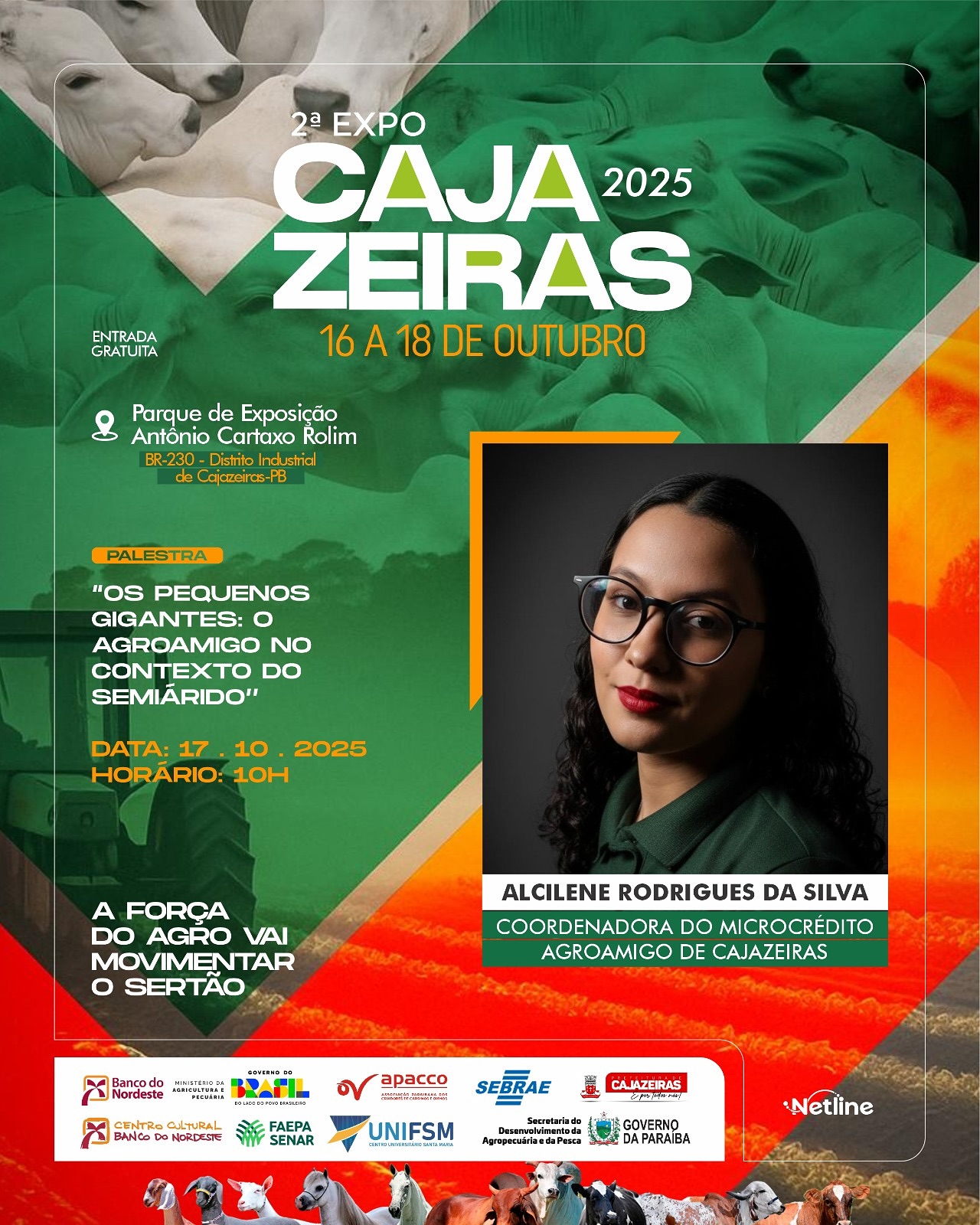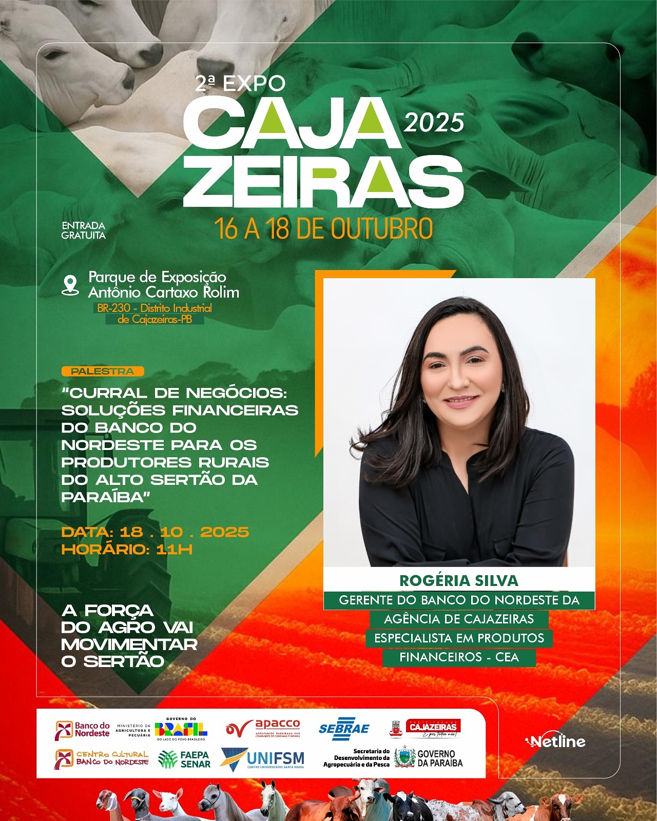 Está tudo pronto para a 2ª ExpoAgro Cajazeiras 2025, que acontece de 16 a 18 de outubro no Parque de Exposição Antônio Cartaxo Rolim. O evento, que tem parcerias do Governo do Estado, da Prefeitura de Cajazeiras e outras entidades públicas e privadas, vai promover diversas palestras, treinamentos, mostra de raças, torneio leiteiro, distribuição de alevinos, stands para negócios, culinária regional e atrações culturais.