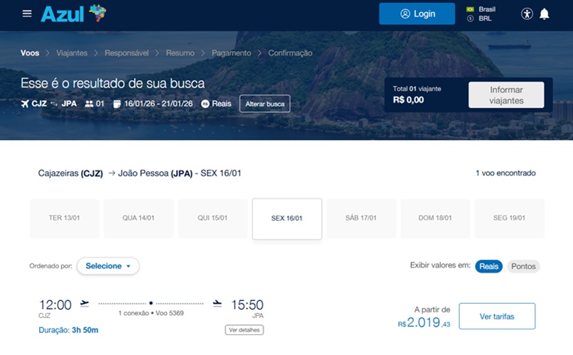 Na simulação, foi considerada a viagem de um adulto, saindo do Aeroporto de Cajazeiras na sexta-feira, 16 de janeiro, com retorno previsto para o dia 19, após quatro dias de permanência em João Pessoa.