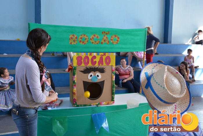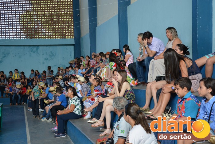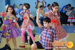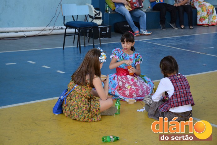 No ginásio da escola, alunos dançaram quadrilha, participaram de brincadeiras com temas regionais e saborearam comidas típicas