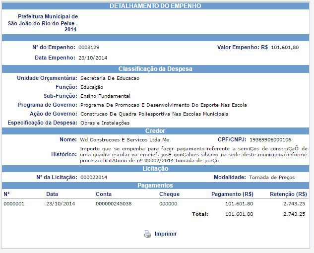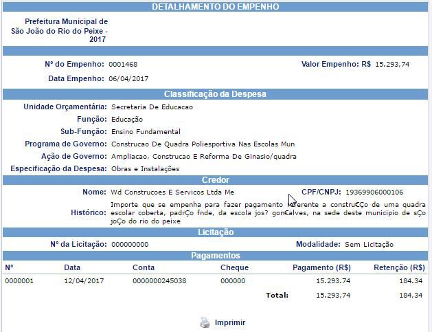 É necessário esclarecer que a empresa WD Construções e Serviços LTDA ME foi a vencedora do processo licitatório nº 00062014, que tinha como objeto “Contratação de empresa de engenharia para construção de quadra escolar na EMEIF José Gonçalves da Silva – Município de São João do Rio do Peixe – PB”. Com essa empresa foi firmado o contrato nº 00090/2014, no valor de R$ 499.876,39.