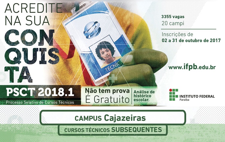 O Instituto Federal da Paraíba está com inscrições abertas para o Processo Seletivo para os Cursos Técnicos (PSCT 2018). Ao todo, estão ofertadas 3.355 vagas para cursos técnicos integrados e subsequentes ao Ensino Médio.