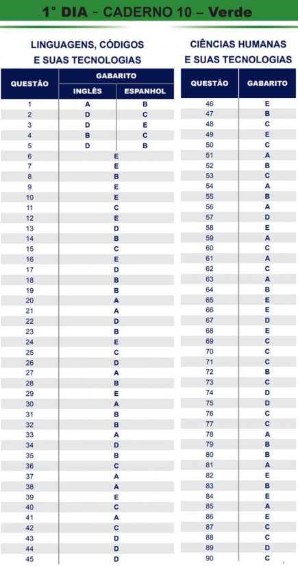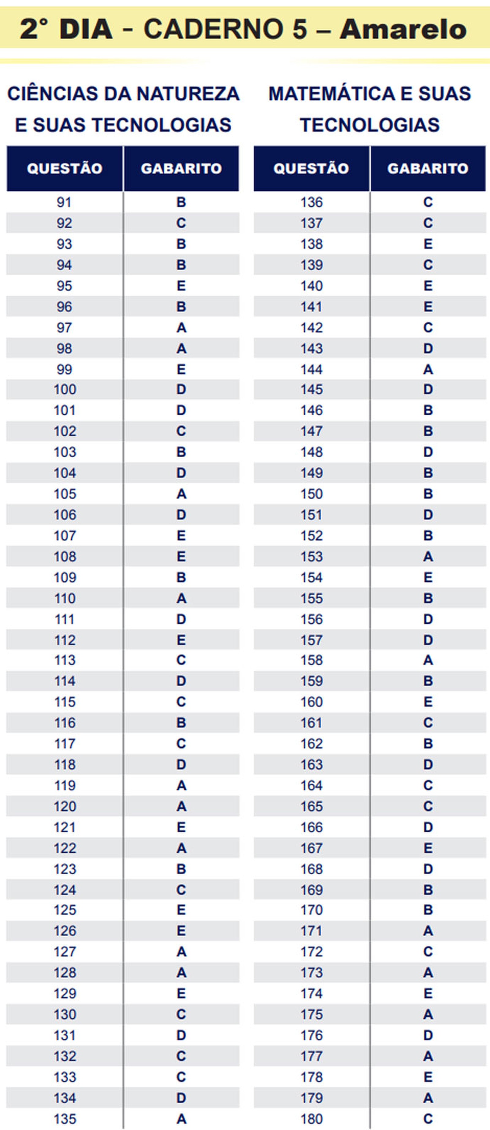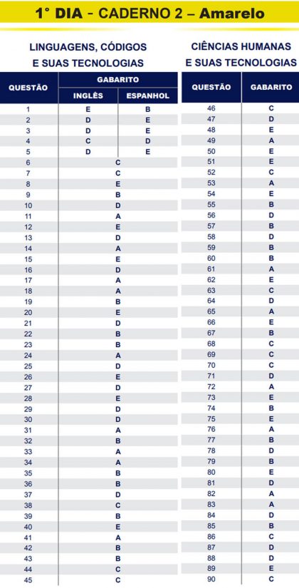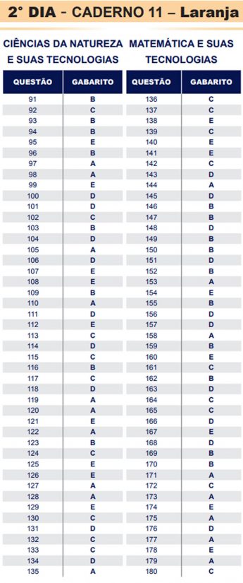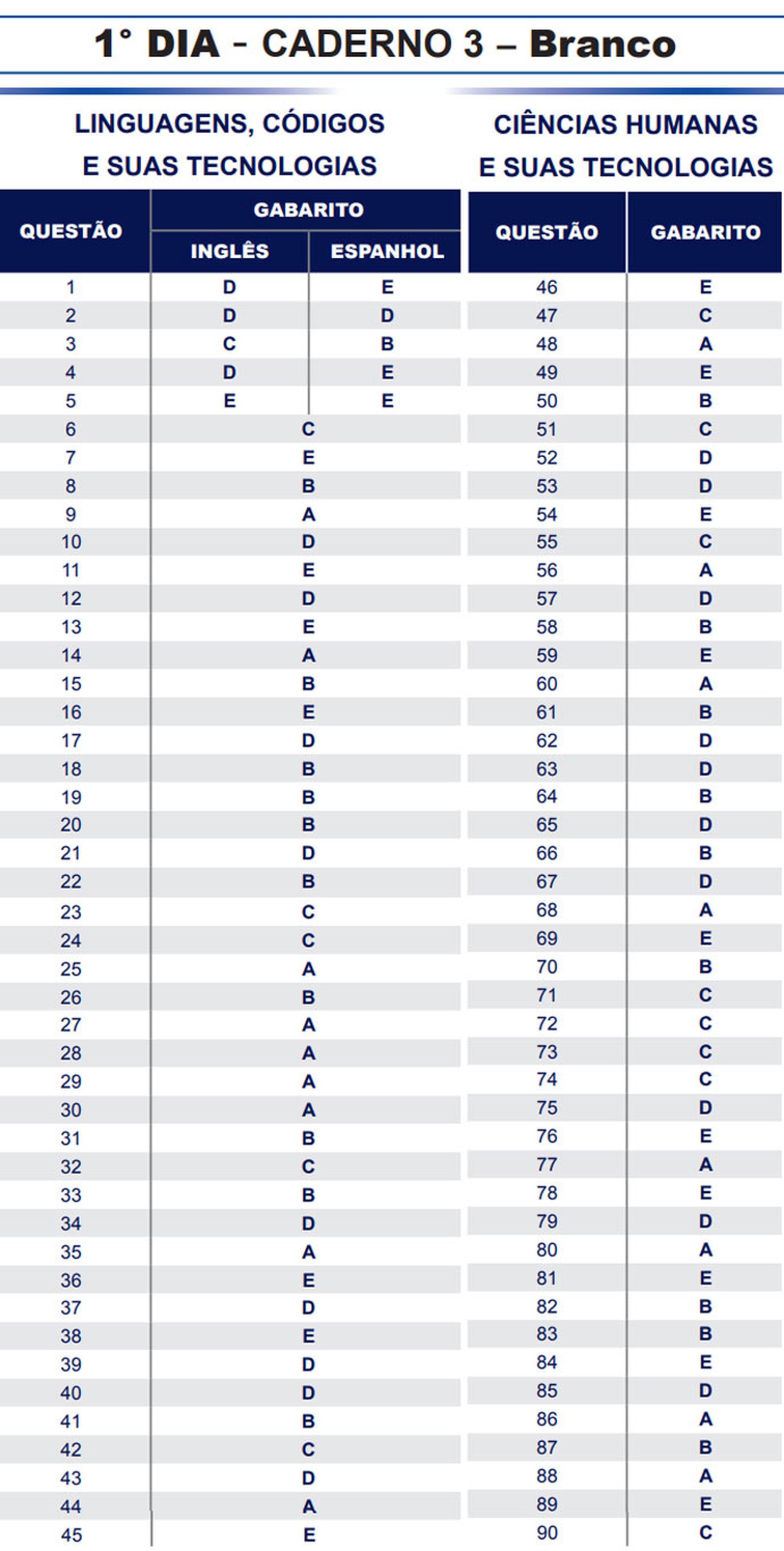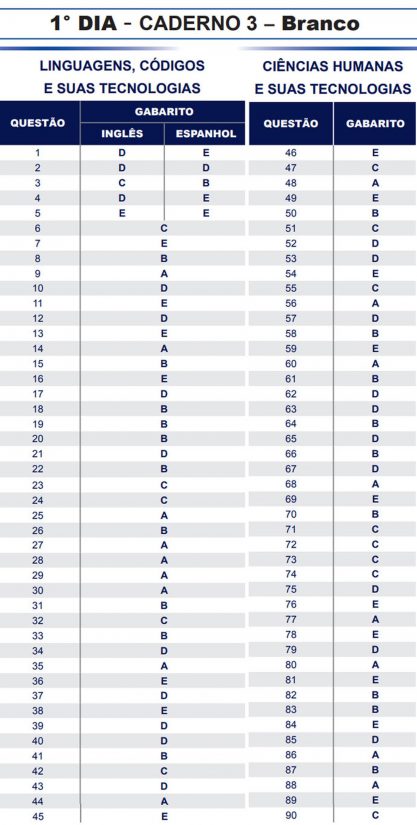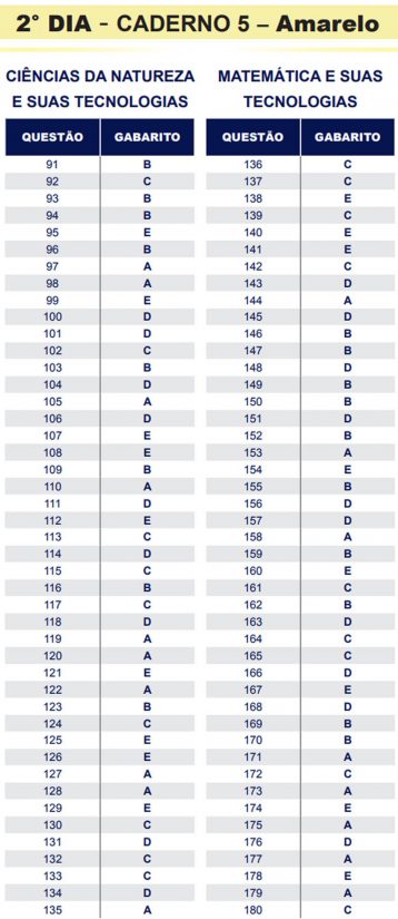 O gabarito oficial do Exame Nacional do Ensino Médio (Enem) foi divulgado nesta terça-feira (14) pelo Instituto Nacional de Estudos e Pesquisas Educacionais Anísio Teixeira (Inep), órgão do Ministério da Educação responsável pela aplicação das provas (abaixo veja o gabarito).