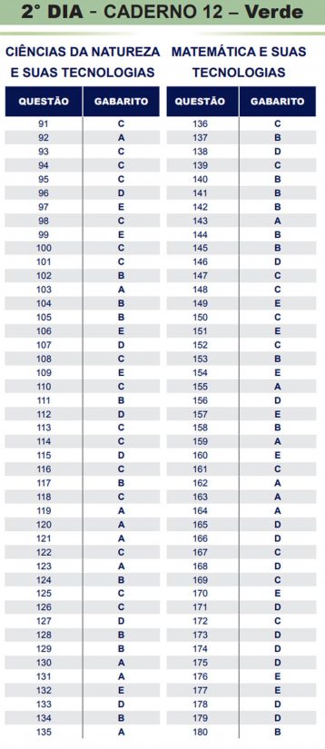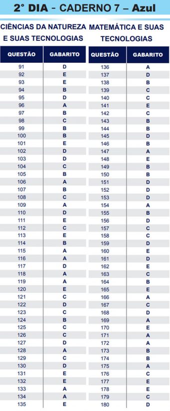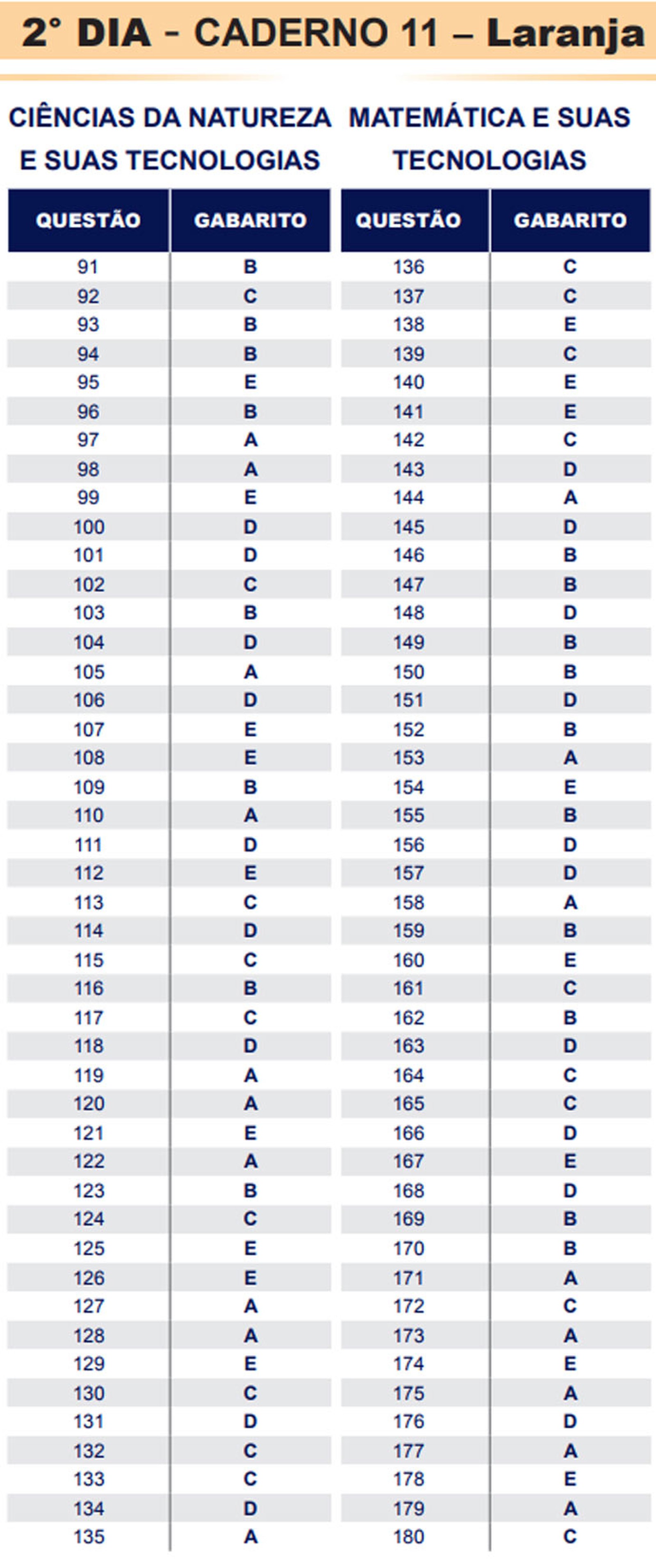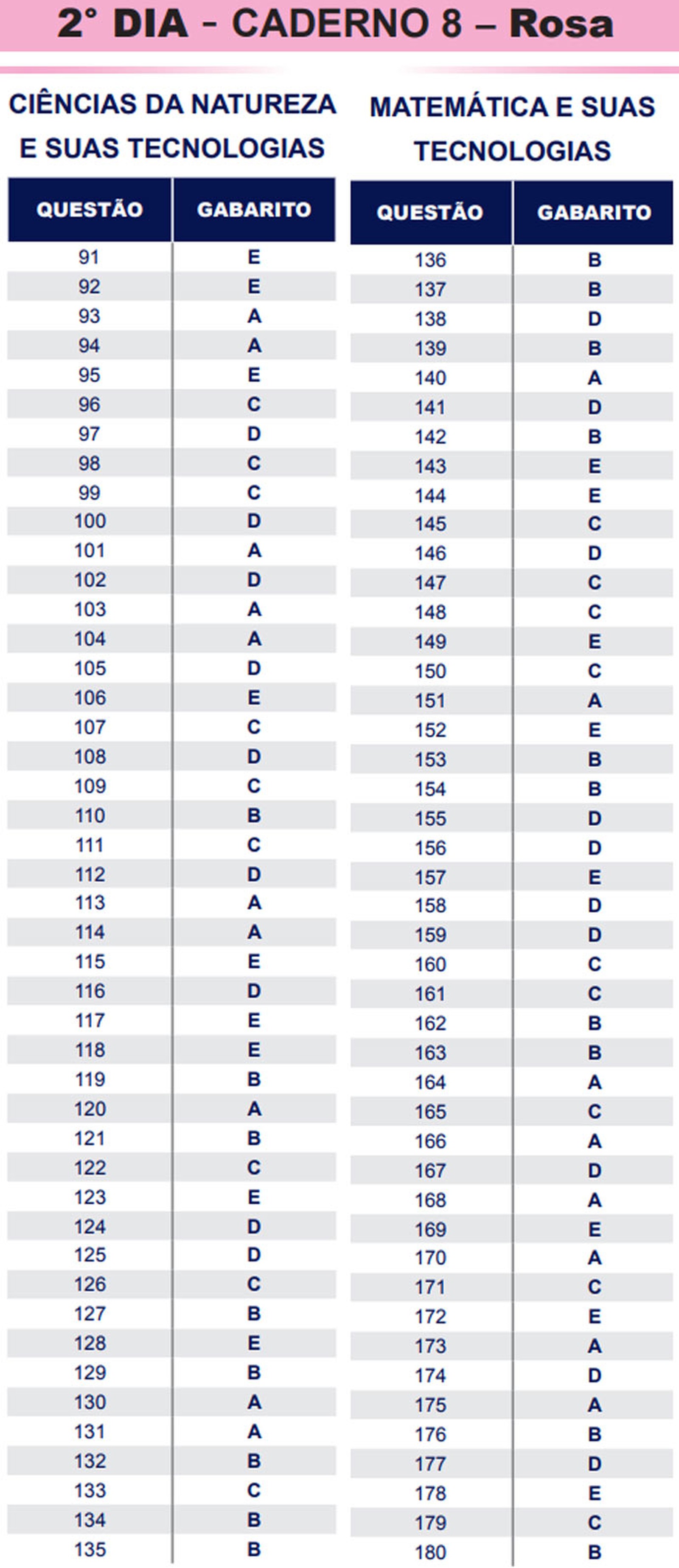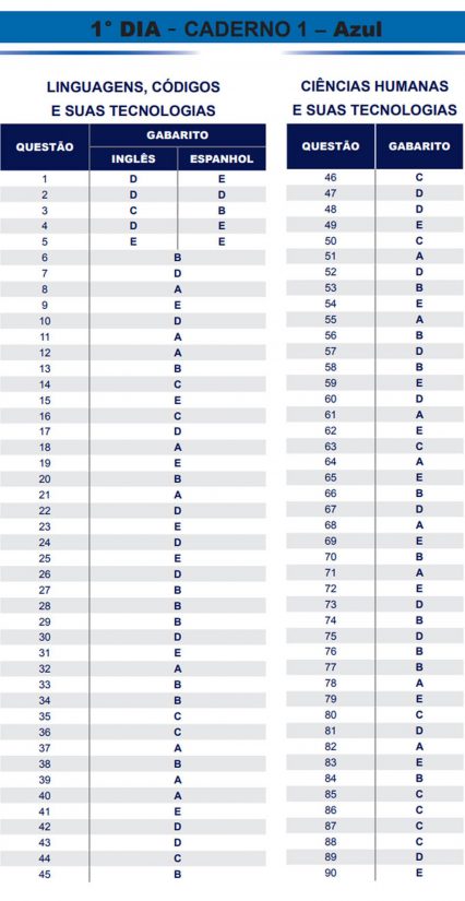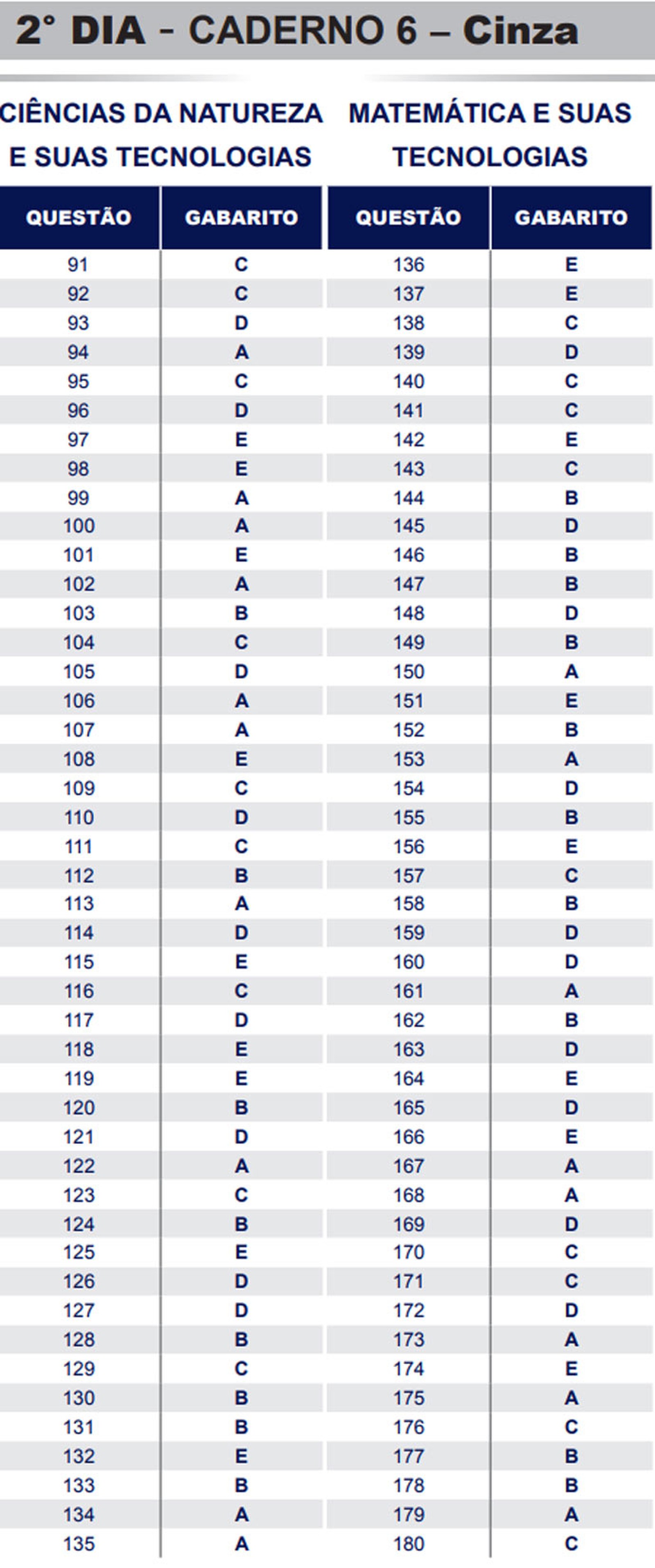 O gabarito oficial do Exame Nacional do Ensino Médio (Enem) foi divulgado nesta terça-feira (14) pelo Instituto Nacional de Estudos e Pesquisas Educacionais Anísio Teixeira (Inep), órgão do Ministério da Educação responsável pela aplicação das provas (abaixo veja o gabarito).