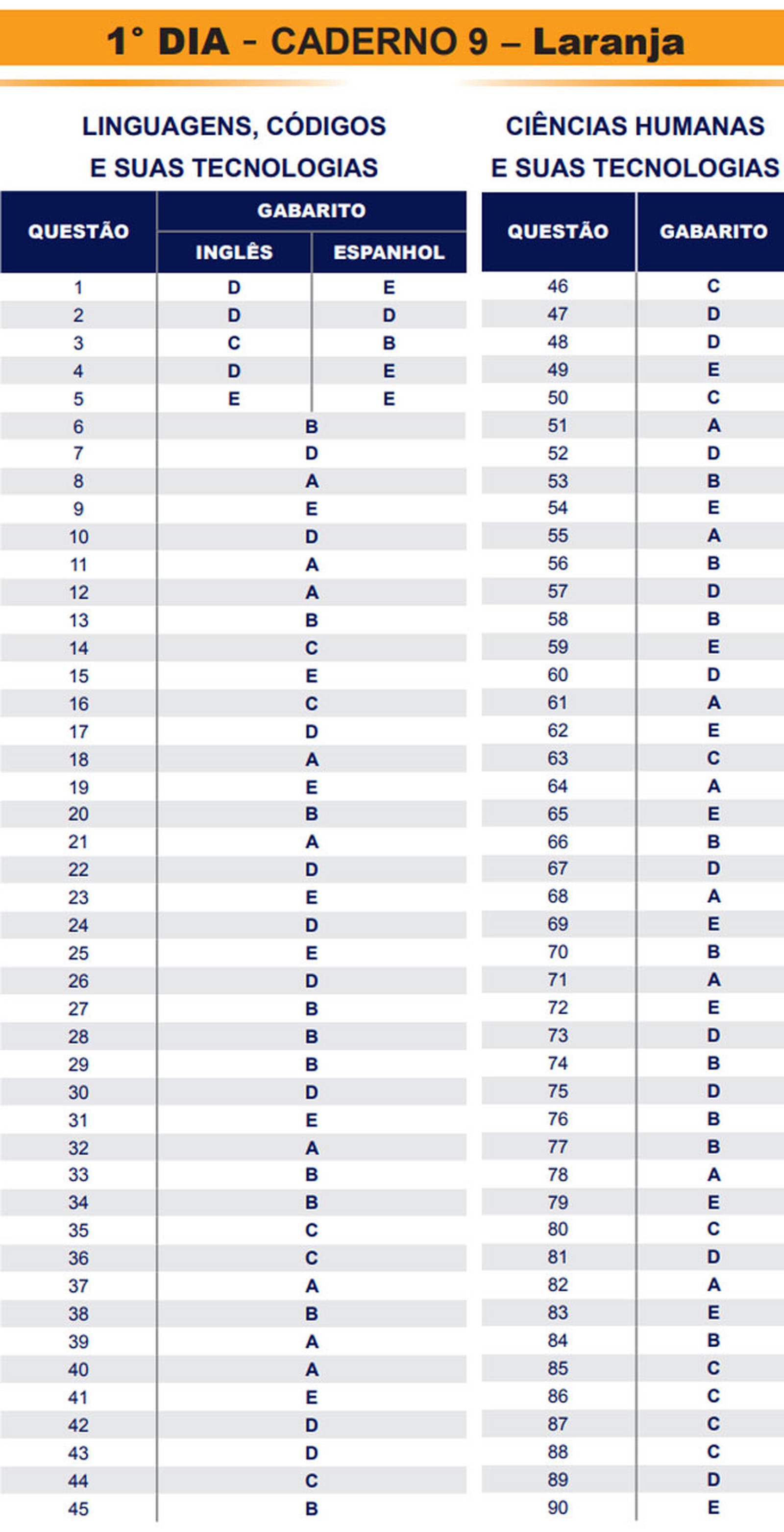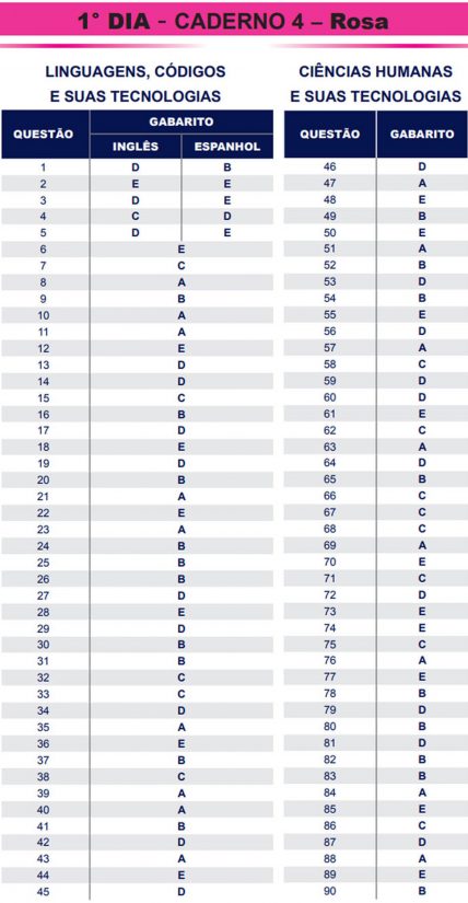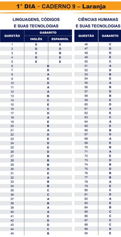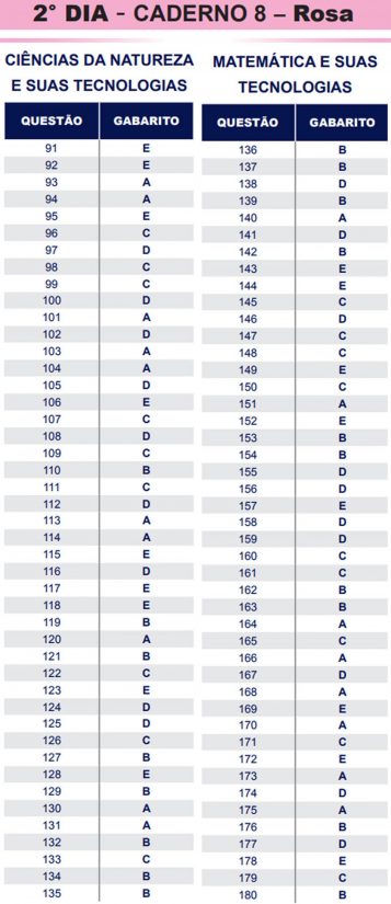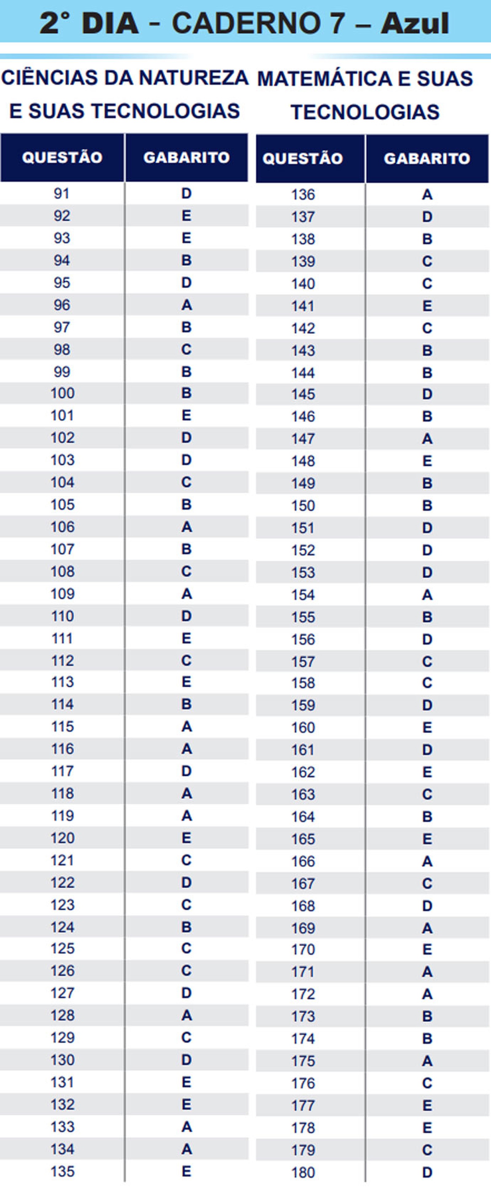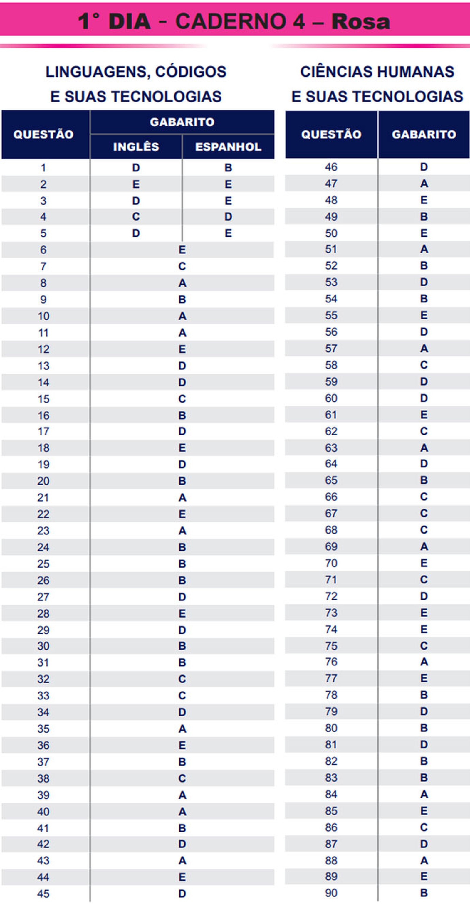 O gabarito oficial do Exame Nacional do Ensino Médio (Enem) foi divulgado nesta terça-feira (14) pelo Instituto Nacional de Estudos e Pesquisas Educacionais Anísio Teixeira (Inep), órgão do Ministério da Educação responsável pela aplicação das provas (abaixo veja o gabarito).