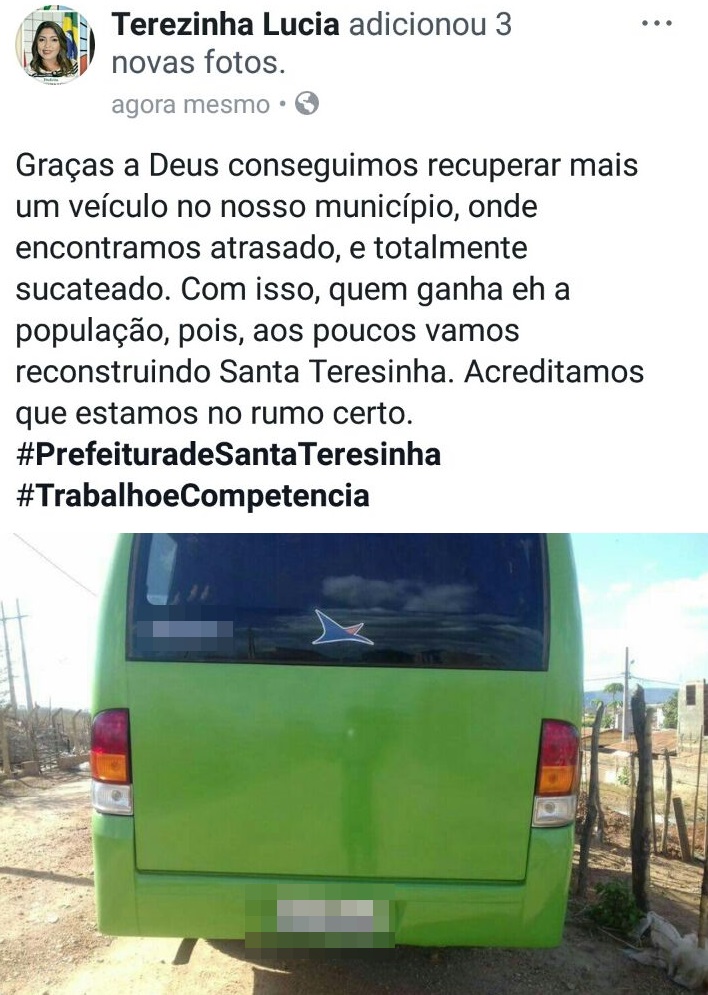 Na sua rede social, a prefeita Terezinha Lúcia (PSDP) comemorou a recuperação do veículo e alegou que encontrou totalmente sucateado da gestão anterior.